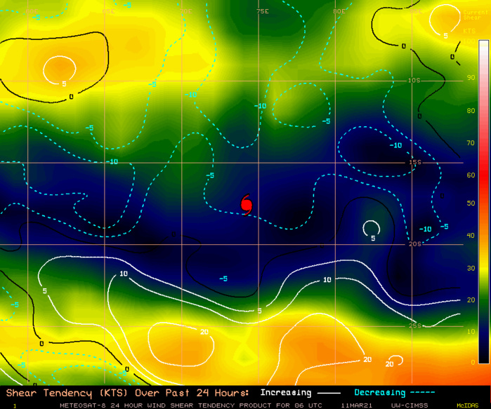 24S(HABANA). 11/06UTC. CIMSS Vertical Shear Magnitude : 4.5 m/s ( 8.7 kts) Direction : 99.2 deg Experimental Vertical Shear and TC Intensity Trend Estimates: UNFAVOURABLE OVER 24H