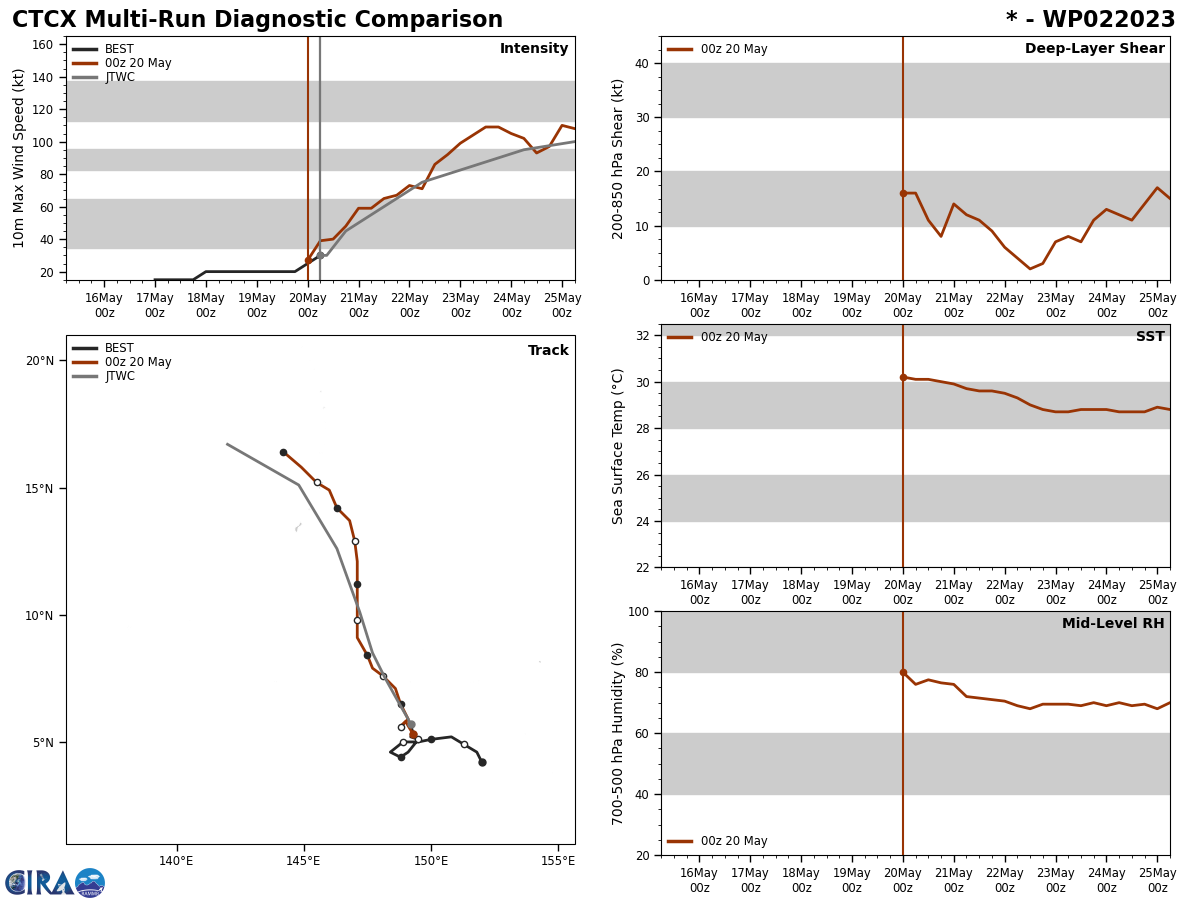 MODEL DISCUSSION: NUMERICAL MODELS ARE IN GOOD AGREEMENT THROUGH TAU 72 WITH A BULK OF THE GUIDANCE CLOSELY FOLLOWING THE JTWC FORECAST TRACK. AFUM, ECMWF ENSEMBLE AND HWRF ARE THE ONLY MEMBERS AT THIS TIME THAT BRING THE SYSTEM WEST OF GUAM. AFTER TAU 72, WITH THE EXCEPTION OF NVGM, ALL MEMBER GUIDANCE SHIFT THE TRACK WEST-NORTHWESTWARD THROUGH THE FORECAST PERIOD. WITH ALL MEMBERS SHOWING ONLY A 130NM CROSS TRACK SPREAD THROUGH TAU 96, THE JTWC FORECAST TRACK IS PLACED CLOSE TO THE MULTI-MODEL CONSENSUS WITH HIGH CONFIDENCE. RELIABLE MODEL INTENSITY GUIDANCE IS IN GOOD AGREEMENT WITH ALL MEMBERS AS WELL AS SEVERAL RAPID INTENSIFICATION (RI) AIDS SHOWING A STEEP INCREASE IN INTENSITY THROUGH TAU 48 AND A MORE GRADUAL INCREASE THROUGH THE FORECAST PERIOD. FOR THIS REASON THE JTWC FORECAST INTENSITY IS PLACED WITH OVERALL MEDIUM CONFIDENCE.