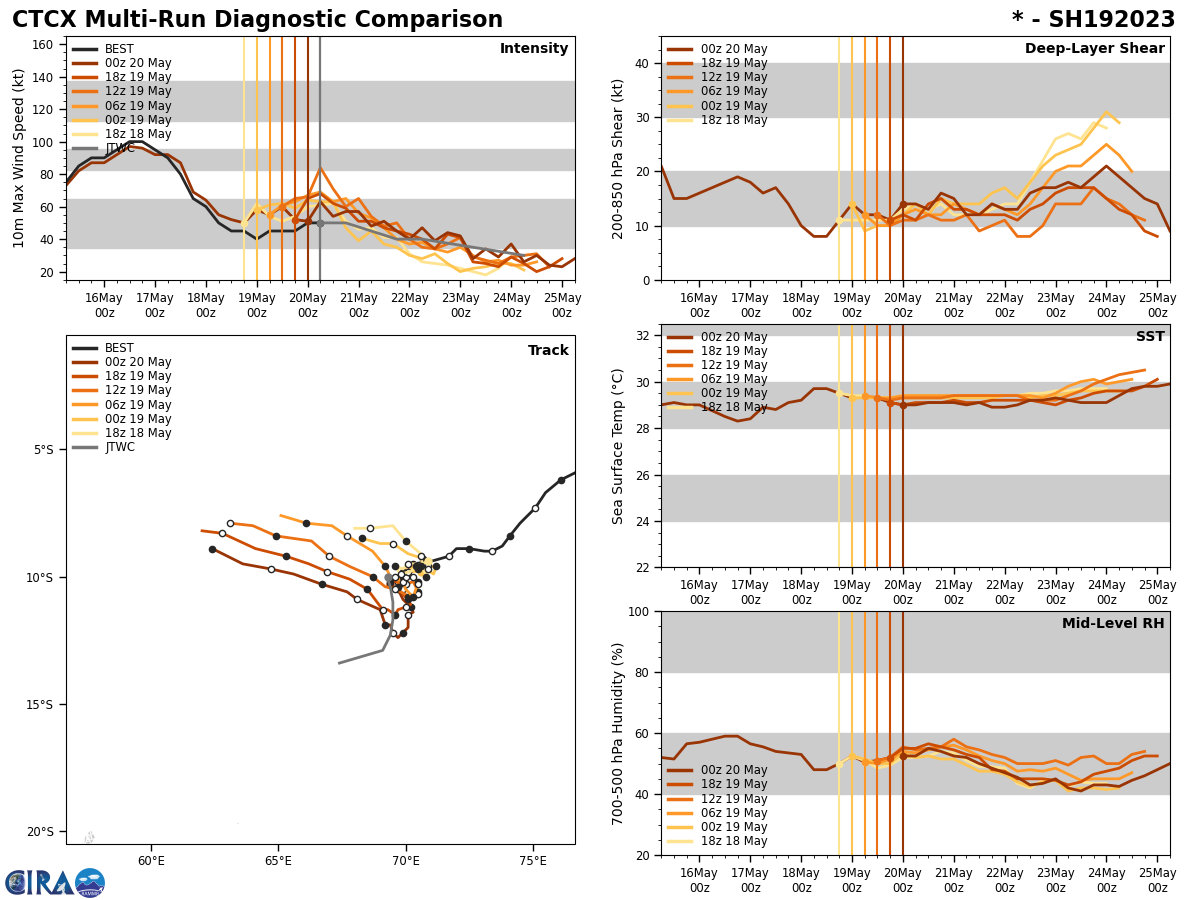 SATELLITE ANALYSIS, INITIAL POSITION AND INTENSITY DISCUSSION: ANIMATED MULTISPECTRAL SATELLITE IMAGERY (MSI) DEPICTS AN ELONGATED CIRCULATION WITH AN ASYMMETRIC CONVECTIVE COVER FULLY OBSCURING THE LOW LEVEL CIRCULATION CENTER (LLCC) BENEATH. A RECENT 200418Z ASCAT-B SCATTEROMERTY PASS REVEALS A SIMILARLY ASYMMETRIC WIND FIELD WITH 45-50 KNOT WINDS EXCLUSIVELY IN THE SOUTHWESTERN QUADRANT WHILE 25-30KT WINDS DOMINATE THE NORTHERN SEMICIRCLE. THE INITIAL POSITION IS PLACED WITH HIGH CONFIDENCE BASED ON SCATTEROMERTY DATA AND MSI IMAGERY. THE INITIAL INTENSITY OF 50KTS IS ASSESSED WITH HIGH CONFIDENCE BASED PRIMARILY ON SCATTEROMETERY DATA THOUGH THE PREPONDERANCE OF INTENSITY ESTIMATES BOTH DVORAK AND CIMMS ALSO INDICATE 19S HAS MAINTAINED 50KTS.