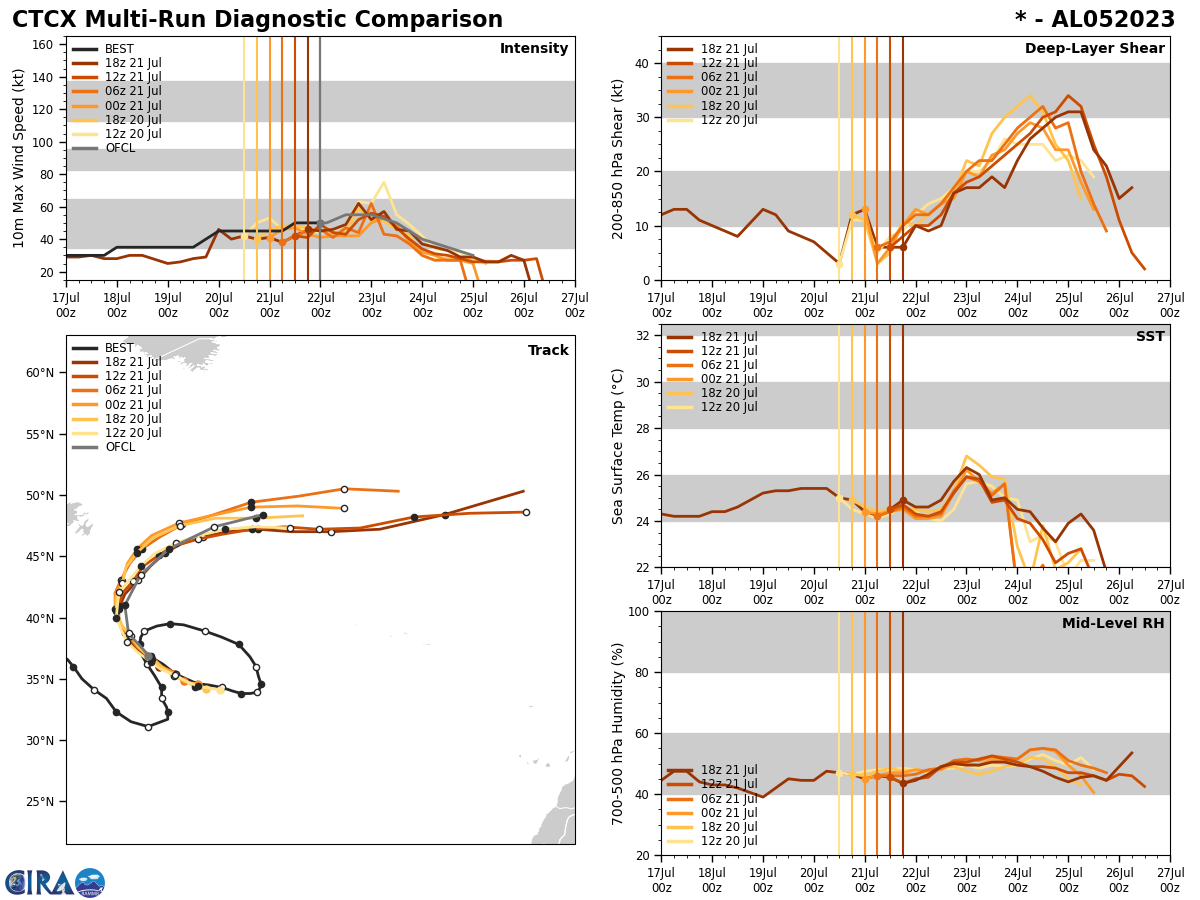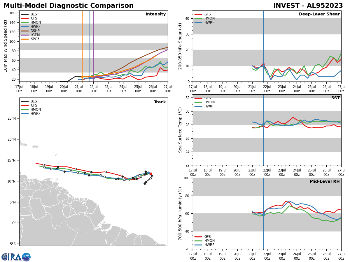 MODEL DISCUSSION: THE GFS, GFS ENSEMBLE MEAN, AND HAFS-A MODEL REMAIN ON THE EASTERN EDGE OF THE LARGE SPREAD ENVELOPE DUE TO A FASTER POLEWARD TURN. THE REST OF THE SPREAD IS SLOW TO GAIN LATITUDE AS THE SYSTEM TAKES ITS TIME DEVELOPING, WHICH IS WHAT CURRENT ANALYSIS INDICATES.