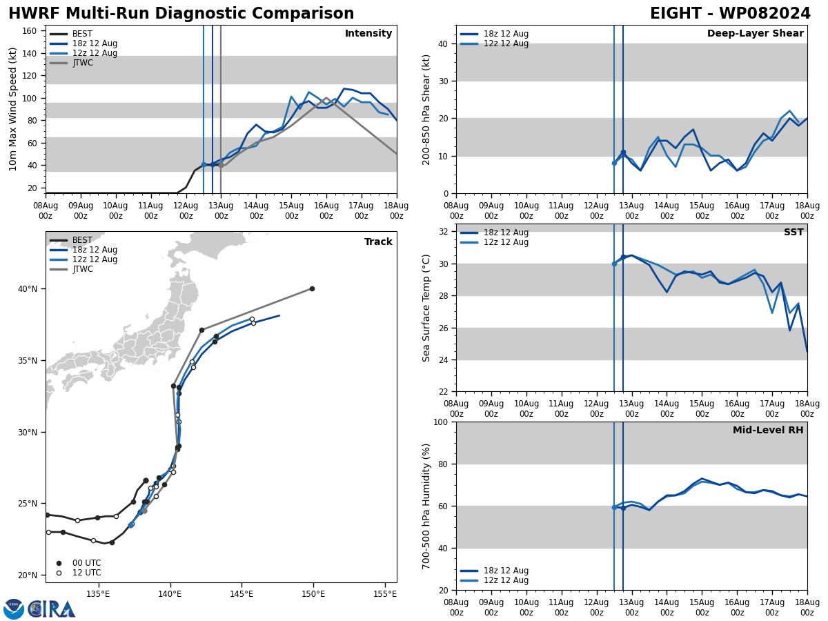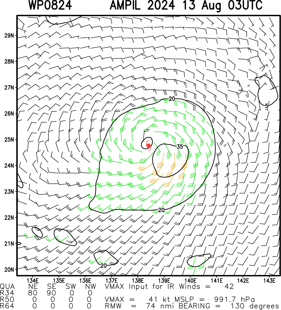 FORECAST REASONING. SIGNIFICANT FORECAST CHANGES: THERE ARE NO SIGNIFICANT CHANGES TO THE FORECAST FROM THE PREVIOUS WARNING. FORECAST DISCUSSION: TROPICAL STORM 08W (AMPIL) IS TRACKING NORTHEASTWARD ALONG THE SOUTHERN RIM OF THE LARGE-SCALE MONSOON GYRE PATTERN IN THE NORTHWEST PACIFIC. AMPIL'S CIRCULATION IS VERTICALLY TILTED DUE TO LIGHT NORTHEASTERLY SHEAR, CAUSED BY NEAR-CALM UPPER-LEVEL WINDS OVERLAYING SOUTHWESTERLY LOWER-LEVEL BACKGROUND FLOW. LIGHT TO MODERATE NORTHEASTERLY OR NORTHERLY SHEAR IS EXPECTED TO PERSIST FOR 36-48 HOURS, WHICH MAY DAMPEN THE STORM'S RATE OF ORGANIZATION, BUT IS NOT STRONG ENOUGH TO PREVENT INTENSIFICATION. THE GFS, HAFS-A, AND ECMWF MODELS INITIALIZED THE VORTEX TILT WELL, AND AGREE ON GRADUAL ALIGNMENT OF THE VORTEX DURING THE NEXT 24-48 HOURS. THE EXACT TIMING OF THIS ALIGNMENT WILL DETERMINE THE PACE OF INTENSIFICATION FOR THE FIRST 48 HOURS, WITH QUICKER ALIGNMENT LEADING TO QUICKER INTENSIFICATION AND VICE VERSA. THE JTWC FORECAST FOLLOWS A CLIMATOLOGICAL INTENSIFICATION RATE IN THE SHORT-TERM, BRINGING AMPIL TO 75 KT IN 48 HOURS AS IT TRACKS WITHIN 130 NM NORTHWEST OF THE ISLAND OF IWO TO. AFTER 48 HOURS, AMPIL WILL INTERACT WITH A DECAYING UPPER-LEVEL LOW (ULL) SOUTHEAST OF HONSHU IN A WAY THAT WILL REDUCE VERTICAL SHEAR AND POTENTIALLY CAUSE FAVORABLE SUPERPOSITION OF THE ULL WITH THE STORM. THIS ENVIRONMENTAL EVOLUTION, COUPLED WITH PASSAGE OVER 30-31 DEGREE CELSIUS SEA SURFACE TEMPERATURES THAT ARE RUNNING 2-3 CELSIUS WARMER THAN CLIMATOLOGY, SHOULD LEAD TO AN INCREASE IN THE INTENSIFICATION RATE BETWEEN 48 AND 72 HOURS. THE JTWC FORECAST BRINGS AMPIL TO A PEAK INTENSITY OF 100 KT BY 72 HOURS. DURING THE 36-72 HOUR PERIOD, THE TRACK IS EXPECTED TO BEND TOWARD THE NORTH AS AMPIL PRESSES AGAINST THE WESTERN PERIPHERY OF A DEEP-LAYER STEERING RIDGE EAST OF JAPAN. MODELS ARE IN GOOD AGREEMENT THAT THIS RIDGE WILL BE CENTERED NEAR THE LATITUDE OF TOKYO DURING THIS TIME, LEADING TO A NEAR-NORTHWARD STEERING CURRENT UNTIL THE STORM REACHES THE SAME LATITUDE. THIS COULD BRING AMPIL CLOSE TO OR OVER HONSHU BEFORE IT TURNS NORTHEASTWARD AROUND THE RIDGE AND INTO THE JET STREAM. THERE REMAINS SIGNIFICANT UNCERTAINTY AS TO WHETHER AMPIL WILL MAKE LANDFALL IN JAPAN, LARGELY DUE TO TRACK UNCERTAINTY IN THE FIRST 48 HOURS CAUSED BY THE VORTEX ALIGNMENT PROCESS. THE JTWC FORECAST TAKES AMPIL CLOSE TO THE COASTLINE OF CHIBA PREFECTURE AS A STRONG TYPHOON. PLEASE NOTE THAT THE POINT OF CLOSEST APPROACH TO JAPAN CURRENTLY FALLS BETWEEN TWO FORECAST POINTS NEAR THE APEX OF TRACK CURVATURE, AND THUS THE STORM MAY PASS CLOSER TO JAPAN THAN THE INTERPOLATED FORECAST TRACK DEPICTS. AFTER 96 HOURS, AMPIL WILL INTERACT WITH THE MID-LATITUDE JET AND BEGIN EXTRATROPICAL TRANSITION WHILE TURNING NORTHEASTWARD OVER COOLER WATERS.