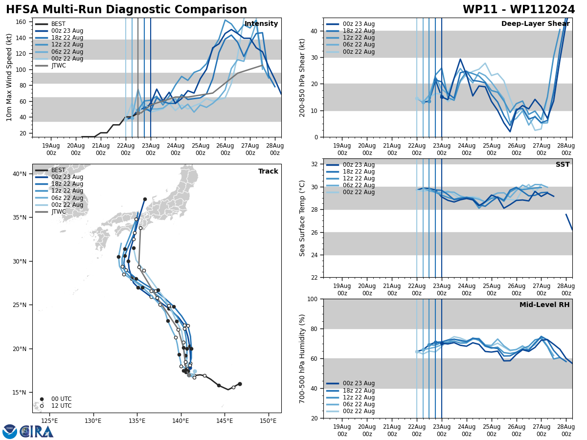 FORECAST REASONING. SIGNIFICANT FORECAST CHANGES: THERE ARE NO SIGNIFICANT CHANGES TO THE FORECAST FROM THE PREVIOUS WARNING. FORECAST DISCUSSION: 11W IS FORECAST TO CONTINUE TRACKING GENERALLY NORTHWARD THROUGH TAU 24, ALONG THE WESTERN PERIPHERY OF THE RIDGING TO ITS EAST. AFTER TAU 24, A BUILDING SUBTROPICAL RIDGE (STR) POSITIONED EAST OF HONSHU WILL TURN THE SYSTEM NORTHWESTWARD THROUGH TAU 72. AFTER TAU 72, 11W IS EXPECTED TO ROUND THE STR AND MAKE ITS WAY NORTHEASTWARD TOWARDS HONSHU BEFORE MAKING LANDFALL NEAR TAU 108. REGARDING INTENSITY, 11W IS FORECAST TO STEADILY INTENSIFY TO 80 KTS AT TAU 48 DUE TO THE UNFAVORABLE PLACEMENT OF THE TUTT CELL. AFTER TAU 48, THE TUTT CELL WILL HAVE PROPAGATED FAR ENOUGH SOUTHWESTWARD TO ALLOW VERTICAL WIND SHEAR TO DRASTICALLY DROP WHICH WILL INTENSIFY 11W AS A RESULT. AN INTENSITY OF 115 KTS IS FORECASTED AT TAU 96, BUT THE PEAK INTENSITY OF THE SYSTEM MAY OCCUR AFTERWARDS, JUST BEFORE LANDFALL. AS THE VORTEX MAKES LANDFALL IN HONSHU, TERRAIN INTERACTION WILL QUICKLY BEGIN WEAKENING THE SYSTEM TO AROUND 65 KTS NEAR THE END OF THE FORECAST PERIOD.