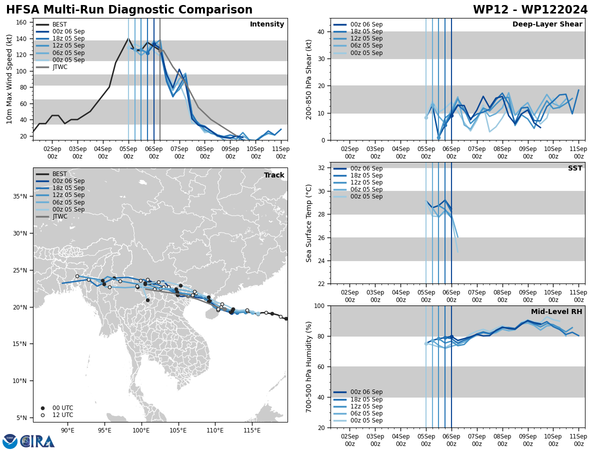 FORECAST REASONING. SIGNIFICANT FORECAST CHANGES: THERE ARE NO SIGNIFICANT CHANGES TO THE FORECAST FROM THE PREVIOUS WARNING. FORECAST DISCUSSION: TY 12W IS FORECAST TO TRACK WESTWARD TO WEST- NORTHWESTWARD THROUGH THE FORECAST PERIOD. AS THE SYSTEM TRACKS OVER HAINAN ISLAND, RAPID WEAKENING WILL COMMENCE DUE TO INTERACTION WITH THE RUGGED TERRAIN. AFTER TAU 12, TY 12W WILL WEAKEN FURTHER AS IT TRACKS ACROSS THE GULF OF TONKIN, WITH LANDFALL OVER NORTHERN VIETNAM EXPECTED NEAR TAU 24. AS THE SYSTEM TRACKS INTO NORTHERN VIETNAM, IT WILL WEAKEN RAPIDLY AND DISSIPATE BY TAU 72.