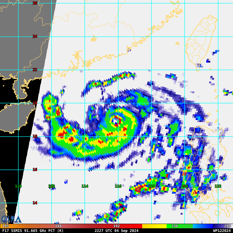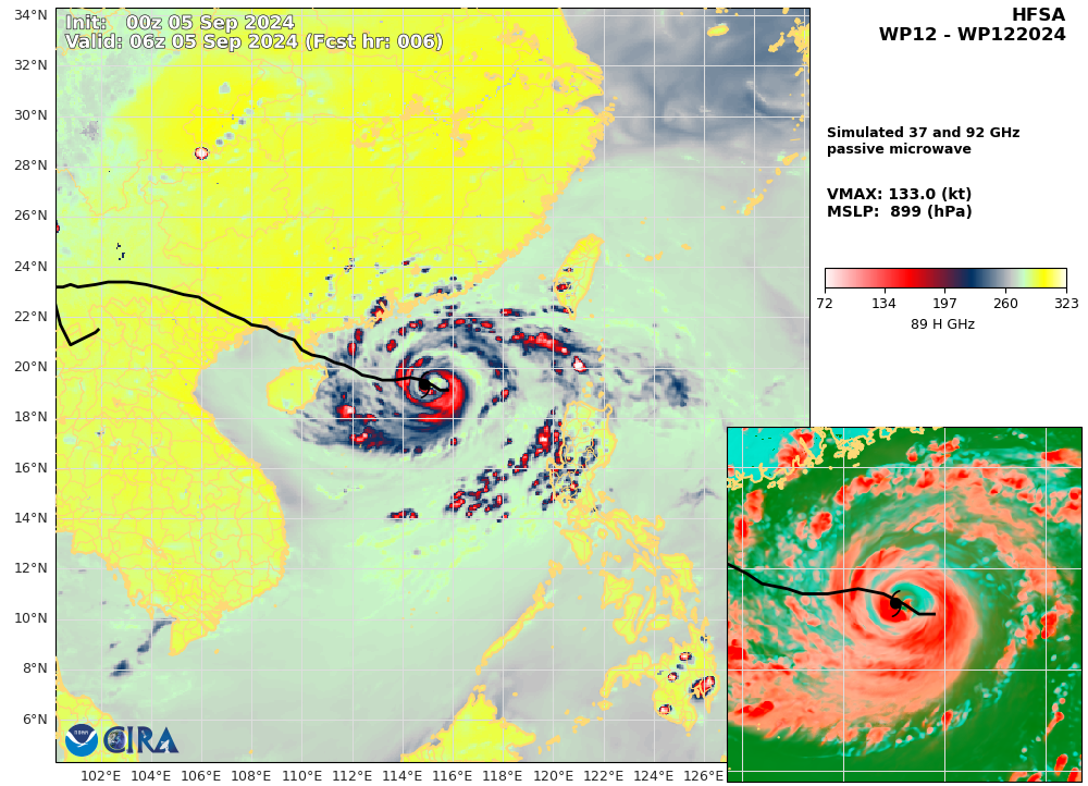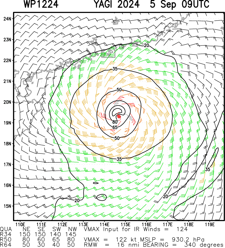 SATELLITE ANALYSIS, INITIAL POSITION AND INTENSITY DISCUSSION: AFTER AN IMPRESSIVE PERIOD OF EXTREMELY RAPID INTENSIFICATION, TYPHOON 12W HAS WEAKENED WHILE UNDERGOING AN EYEWALL REPLACEMENT CYCLE (ERC) AS PREDICTED BY THE CIMSS M-PERC PRODUCT. ANIMATED ENHANCED INFRARED (EIR) SATELLITE IMAGERY DEPICTS A 15NM ROUND EYE, WHICH SUPPORTS THE INITIAL POSITION WITH HIGH CONFIDENCE. EIR IMAGERY, HOWEVER, DOES SHOW A CLEAR WEAKENING TREND WITH EROSION OF THE EYEWALL OVER THE NORTHWESTERN QUADRANT AND WARMING CLOUD TOP TEMPERATURES. A 050546Z ATMS 88.2GHZ MICROWAVE IMAGE REVEALS A COMPACT EYEWALL WITH A BREAK IN THE EYEWALL OVER THE NORTHWESTERN QUADRANT, WITH FRAGMENTED SPIRAL BANDING. ENVIRONMENTAL CONDITIONS REMAIN FAVORABLE WITH RADIAL OUTFLOW AND LOW VERTICAL WIND SHEAR THUS, THE CURRENT WEAKENING TREND IS SOLELY ATTRIBUTED TO THE ERC. THE INITIAL INTENSITY OF 125 KTS IS ASSESSED WITH MEDIUM CONFIDENCE BASED ON AGENCY CURRENT INTENSITY ESTIMATES, WITH OBJECTIVE ESTIMATES RANGING FROM 117 TO 124 KNOTS.