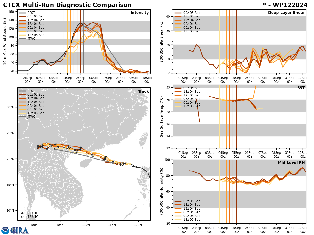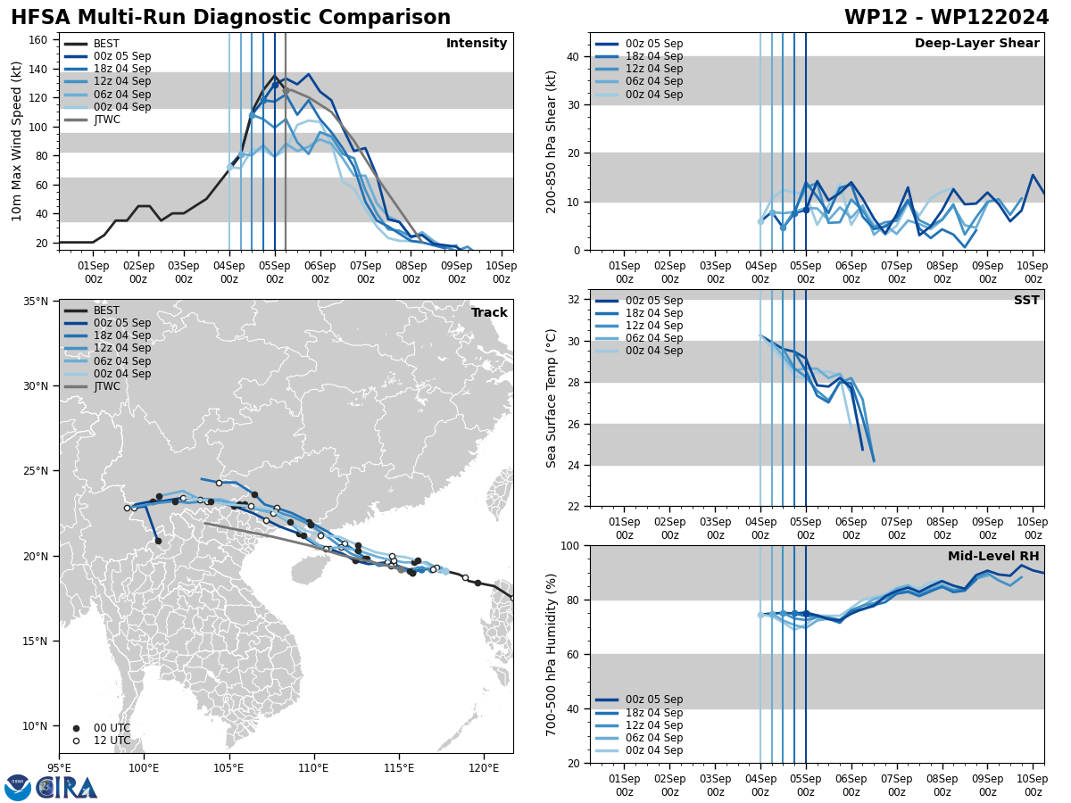 FORECAST REASONING. SIGNIFICANT FORECAST CHANGES: THERE ARE NO SIGNIFICANT CHANGES TO THE FORECAST FROM THE PREVIOUS WARNING. FORECAST DISCUSSION: TYPHOON 12W PEAKED AT ABOUT 135-140 KNOTS NEAR 042100Z AS REFLECTED IN EARLIER SAR DATA BUT HAS SUBSEQUENTLY WEAKENED DUE TO THE ONGOING ERC. WHILE ENVIRONMENTAL CONDITIONS REMAIN FAVORABLE OVER THE NEXT 12 HOURS, SOME RE-INTENSIFICATION IS POSSIBLE AFTER THE ERC COMPLETES. AFTER TAU 12, THE SYSTEM WILL TRACK WESTWARD APPROACHING HAINAN ISLAND, WITH A MORE PRONOUNCED WEAKENING TREND DUE TO INTERACTION WITH LAND. AFTER TAU 24, RAPID WEAKENING WILL OCCUR AS THE SYSTEM TRACKS OVER SOUTHERN CHINA AND NORTHERN VIETNAM, WITH LANDFALL EXPECTED NEAR TAU 48. AS THE SYSTEM TRACKS INTO THE RUGGED TERRAIN OF NORTHERN VIETNAM, IT WILL DISSIPATE BY TAU 72.