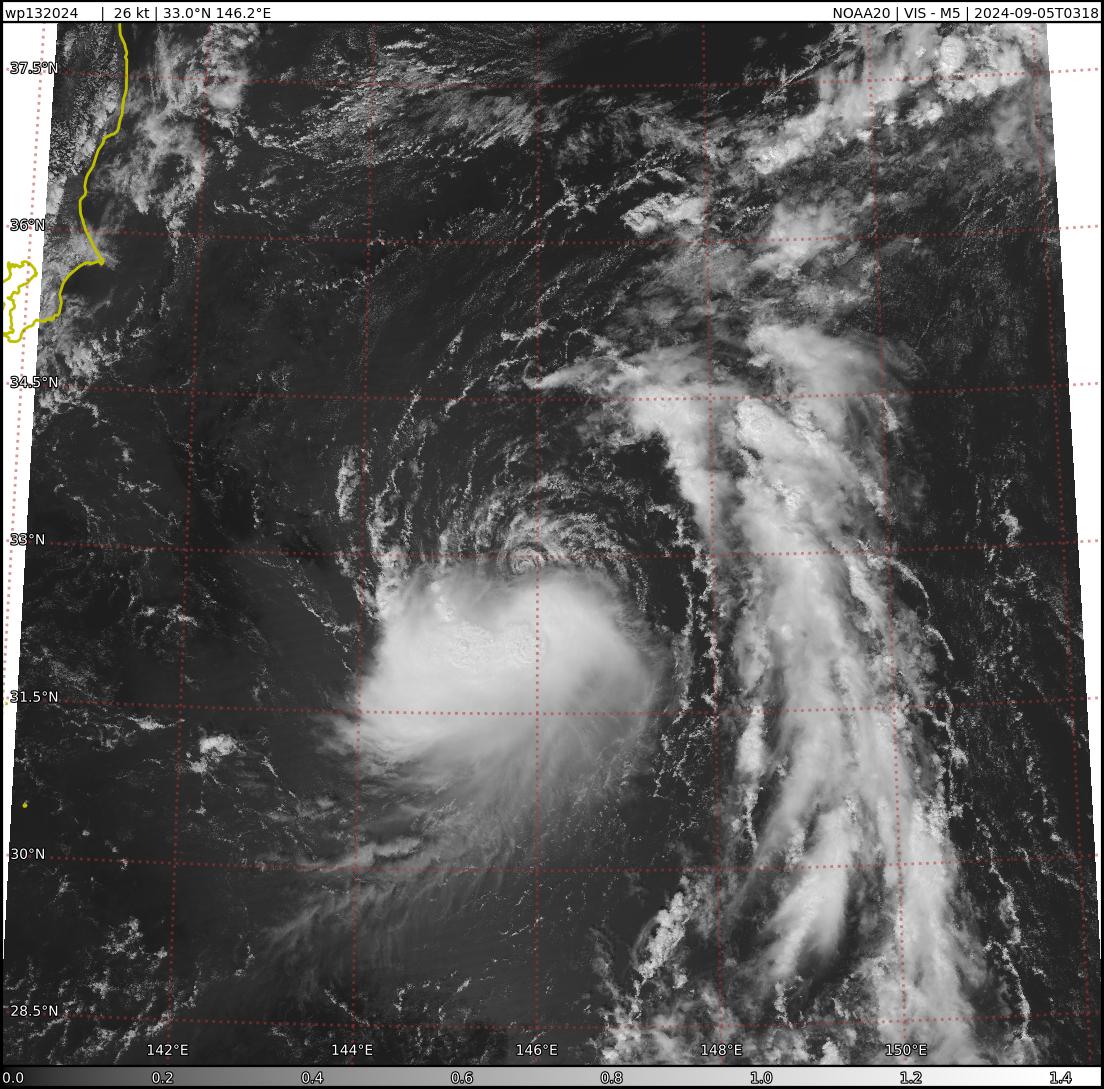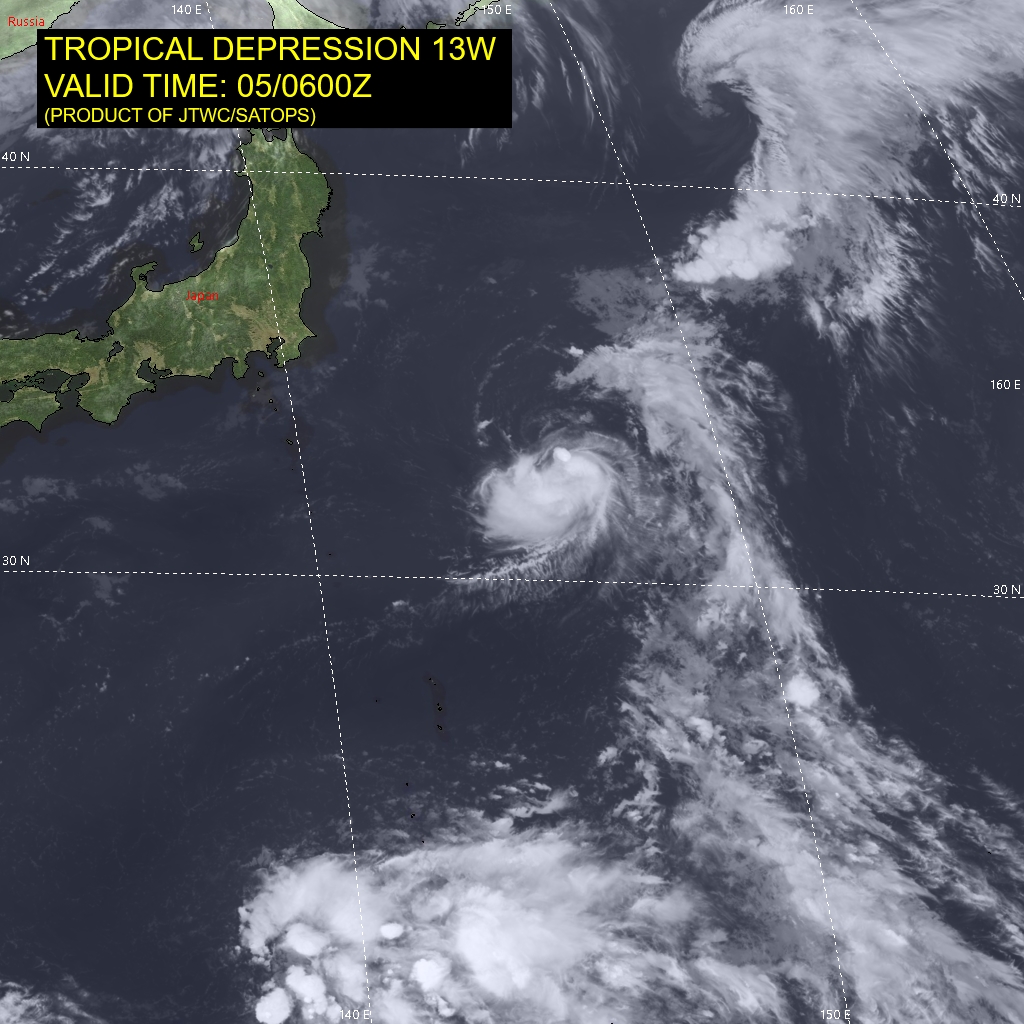 FORECAST REASONING. SIGNIFICANT FORECAST CHANGES: THERE ARE NO SIGNIFICANT CHANGES TO THE FORECAST FROM THE PREVIOUS WARNING. FORECAST DISCUSSION: TD 13W HAS A FEW ADVANTAGES IN THE SHORT TERM, INCLUDING THE VIGOROUS EQUATORWARD OUTFLOW MENTIONED ABOVE, A WELL-WRAPPED LOW LEVEL CLOUD SYSTEM, AND WARM SSTS OF 27-28C THROUGHOUT THE FORECAST PERIOD. ALTHOUGH THE INTENSITY WEAKENED SLIGHTLY (BY 5 KTS) AFTER THE SYSTEM BECAME DECOUPLED, THE MARGINALLY FAVORABLE ENVIRONMENTAL CONDITIONS WILL ALLOW THE INTENSITY TO FLUCTUATE UPWARDS TO 35 KTS AGAIN NEAR TAU 12. HOWEVER, THE POSITION IN RELATION TO THE TUTT CELL OVERHEAD IS PROBLEMATIC DUE TO A WEAK CONVERGENT INFLUENCE ALOFT, WHICH WILL INHIBIT FURTHER DEVELOPMENT. TD 13W HAS A STRONG STEERING INFLUENCE WHICH WILL RECURVE IT AROUND THE STR AXIS AND CAUSE IT TO ACCELERATE NORTHEASTWARD AS IT NEARS THE MID-LATITUDE WESTERLIES. THE ENVIRONMENT WILL BECOME INCREASINGLY HOSTILE WITH UNFAVORABLE VWS (30-34 KTS) BY TAU 24 AND BEYOND. BY TAU 36, THE SYSTEM WILL VENTURE INTO MID-LATITUDE TERRITORIES WHERE A STRONG SHARED ENERGY JET MAX EXISTS POLEWARD. A BAROCLINIC INFLUENCE IN THE HIGHER LATITUDES WILL LEAD TO THE EXTRATROPICAL TRANSITION OF TD 13W BY TAU 48.