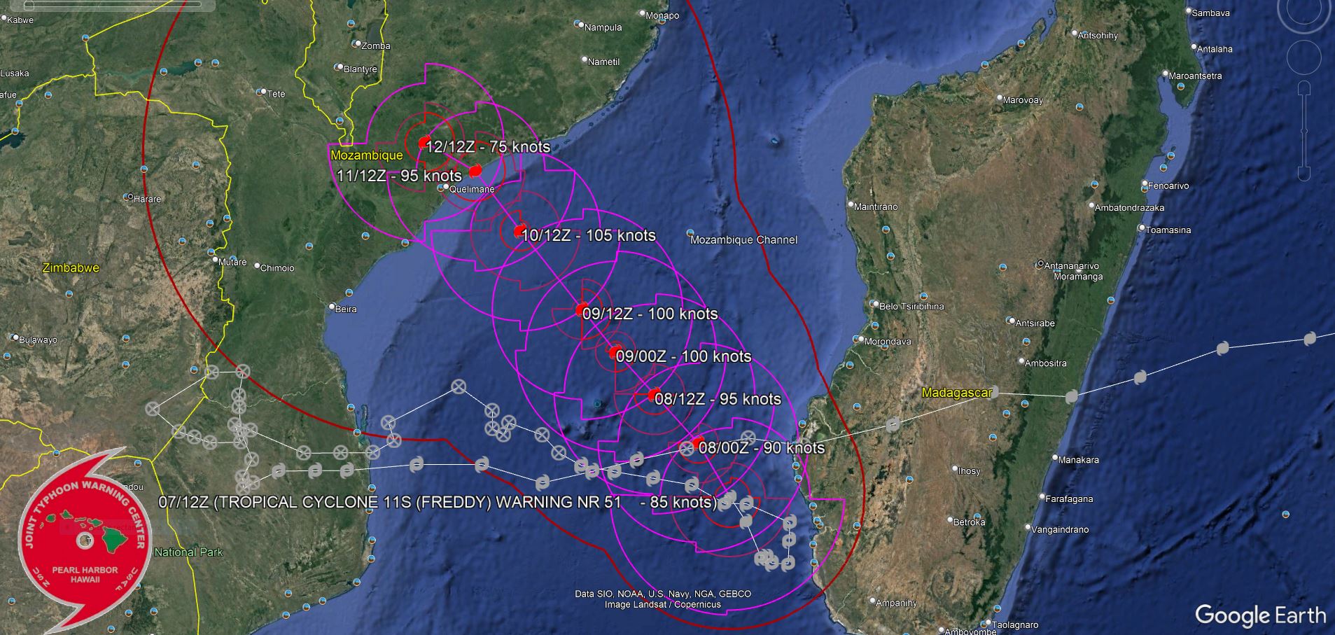 FORECAST REASONING. SIGNIFICANT FORECAST CHANGES: RECENT RAPID INTENSIFICATION DUE TO DECREASING LAND INTERACTION AND UPWELLING AS THE SYSTEM MOVES INTO THE CHANNEL. FORECAST DISCUSSION: HAVING ONCE AGAIN ACHIEVED TYPHOON STRENGTH VIA RAPID INTENSIFICATION, TC 11S (FREDDY) IS FORECAST TO CONTINUE NORTHWESTWARD UNDER THE STEERING INFLUENCE OF BUILDING STR TO THE SOUTHWEST. CURRENTLY IN A FAVORABLE ENVIRONMENT CHARACTERIZED BY WARM SEA SURFACE TEMPERATURES, GOOD OUTFLOW ALOFT AND LOW VERTICAL WIND SHEAR, TC 11S IS FORECAST TO CONTINUE ITS INTENSIFICATION TREND AS IT PROGRESSES INTO THE MOZAMBIQUE CHANNEL. WHILE THE SYSTEM IS CURRENTLY SURROUNDED BY DRY AIR, THERE IS NO SIGN OF SIGNIFICANT ENTRAINMENT INTO THE CORE OF THE TC. IF 11S CAN MAINTAIN THIS MOIST CORE, COUPLED WITH THE AFOREMENTIONED FAVORABLE CHARACTERISTICS, 11S IS FORECAST TO PEAK BY TAU 72 NEAR 105KTS. NEAR TAU 96, 11S WILL MAKE LANDFALL ONCE AGAIN OVER MOZAMBIQUE AND PROCEED INLAND WHERE IT IS FORECAST TO QUICKLY WEAKEN THROUGH THE FORECAST PERIOD.