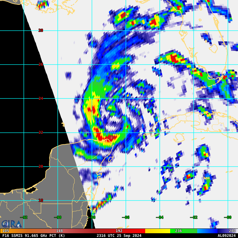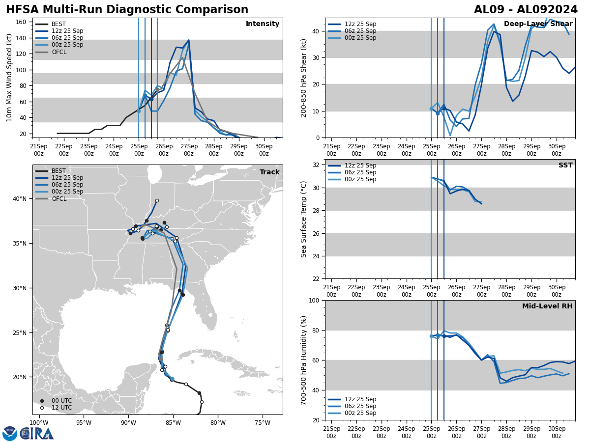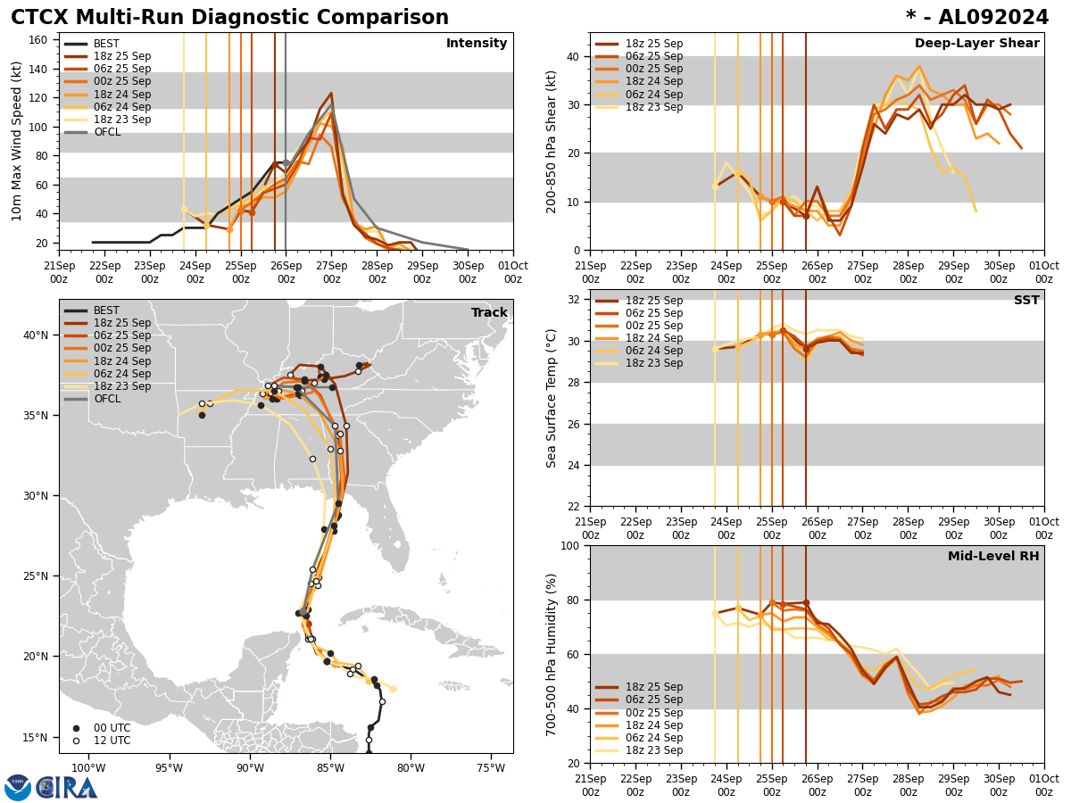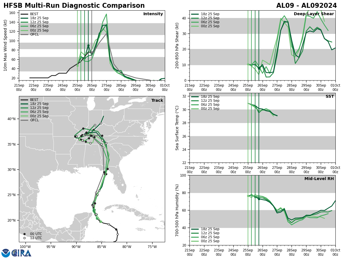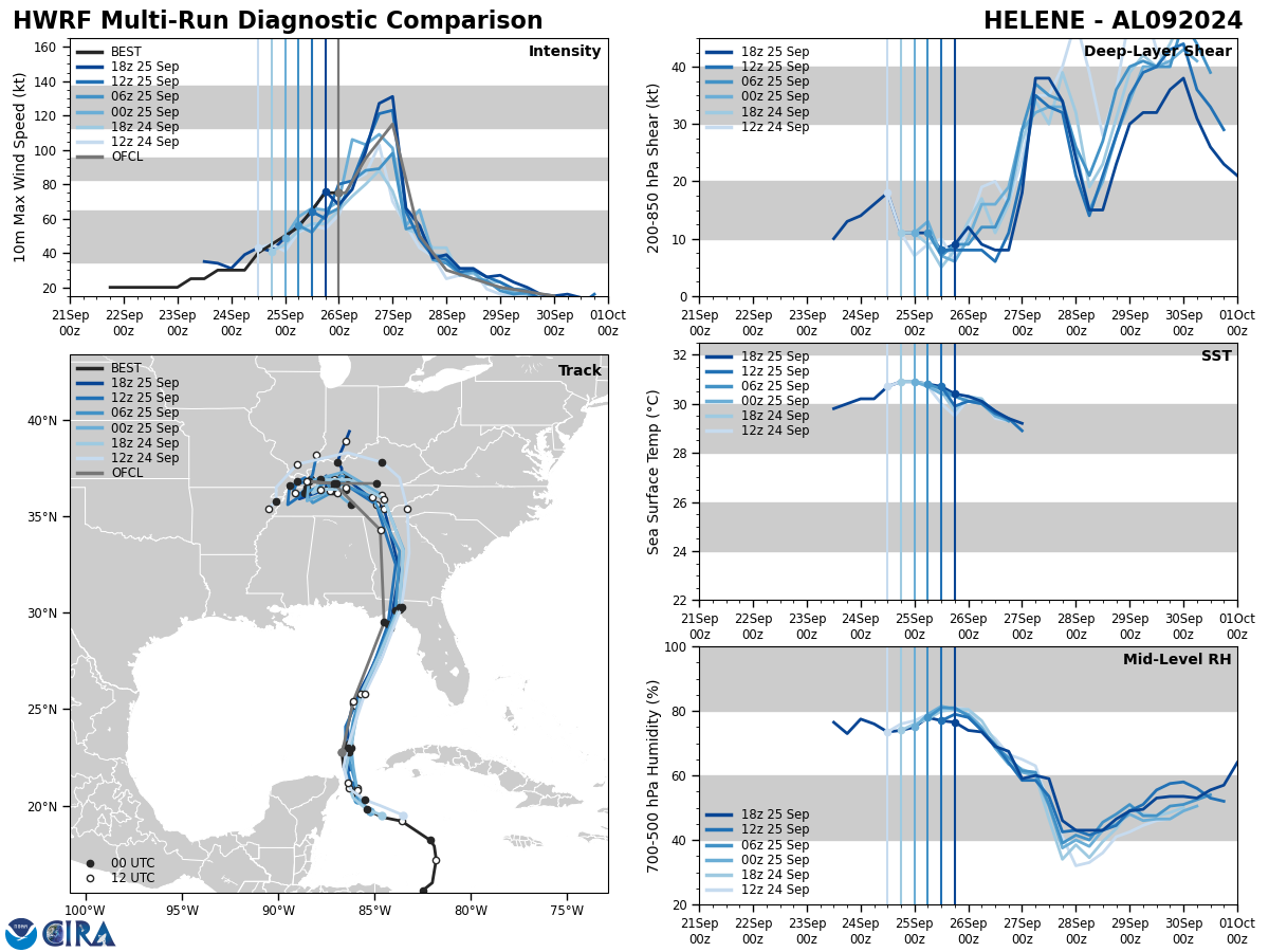 Satellite images show that Helene has a well-organized appearance, with numerous convective banding features. A ragged-looking eye feature is also apparent. However, reports from both Air Force and a NOAA Hurricane Hunter aircraft investigating the system suggest that the it lacks a well-defined inner core with a somewhat broad maximum wind field for now. The central pressure has dropped a little to around 972 mb. Given the slowly falling central pressure, the intensity is maintained at 75 kt for this advisory. Helene's structure and intensity will continue to be closely monitored by Hurricane Hunter aircraft tonight and Thursday. The hurricane continues moving northward with an estimated initial motion of 360/08 kt. For the next couple of days, the steering scenario for this system remains basically unchanged from the earlier advisory. The flow between a mid-tropospheric trough over the east-central United States and a ridge over the western Atlantic should result in Helene accelerating northward to north-northeastward during the next 24 to 36 hours. This motion will bring the center of Helene to the northeastern Gulf of Mexico coast in about 24 hours. The official track forecast through landfall is very similar to the previous NHC prediction and remains close to the corrected consensus guidance. After landfall, the trough to the northwest of the tropical cyclone becomes a cutoff low, and Helene should turn leftward as it rotates around the low. In 3-4 days, the system should become a shallow extratropical cyclone within weaker steering currents. Helene should be in an atmospheric and oceanic environment over the eastern Gulf of Mexico that will be very conducive for strengthening. The system is expected to traverse the Loop Current, which has especially high oceanic heat content. This, along with fairly low vertical wind shear and a moist mid- to lower- tropospheric air mass, should likely result in rapid intensification before landfall. The official forecast continues to call for the hurricane to reach category 4 status tomorrow. It should be noted that the HAFS-A and HAFS-B regional hurricane models show even more intensification than indicated here. Helene is forecast to be a large major hurricane when it reaches the Big Bend coast of Florida. As a result, storm surge, wind, and rainfall impacts will extend well away from the center and outside the forecast cone, particularly on the east side. In addition, the fast forward speed when Helene moves inland will result in a far inland penetration of strong winds over parts of the southeastern United States, including strong gusts over higher terrain of the southern Appalachians. A higher-than-normal gust factor is indicated in the official forecast while Helene is inland.