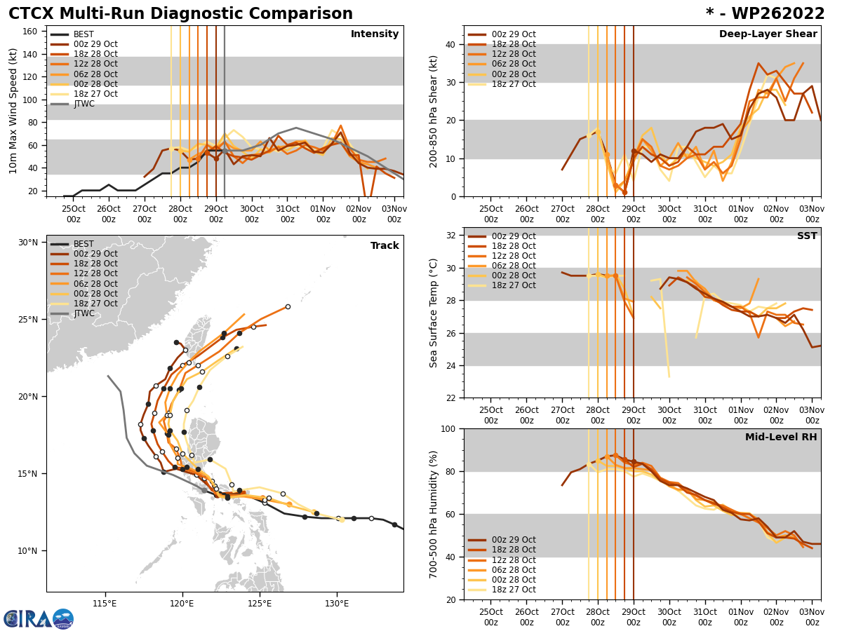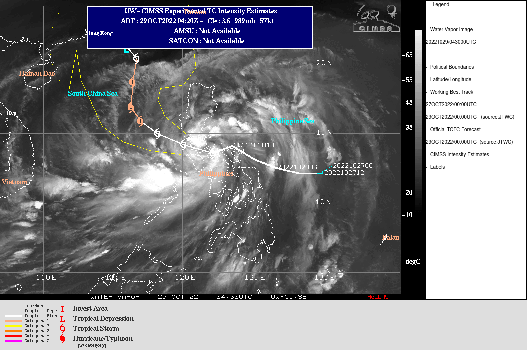 FORECAST REASONING. SIGNIFICANT FORECAST CHANGES: THERE ARE NO SIGNIFICANT CHANGES TO THE FORECAST FROM THE PREVIOUS WARNING. FORECAST DISCUSSION: TROPICAL STORM 26W HAS TRACKED WEST-NORTHWEST OVER THE PAST SIX HOUR ALONG THE SOUTHERN PERIPHERY OF A DEEP-LAYER SUBTROPICAL RIDGE (STR) POSITIONED TO THE NORTHEAST. THE SYSTEM WILL CONTINUE TO TRACK OVER THE CENTRAL PHILIPPINE ISLAND OF LUZON JUST SOUTH OF MANILA, AND REEMERGE INTO THE SOUTH CHINA SEA BY TAU 12. ALL GUIDANCE INDICATES A GENERAL WEST-NORTHWEST TRACK THROUGH TAU 36. HOWEVER, BY TAU 48, MODEL GUIDANCE INDICATES THE WESTERN SIDE OF THE STR WILL ERODE AND WEAKEN AHEAD OF AN APPROACHING MID-LATITUDE TROUGH, WHICH WILL ALLOW THE SYSTEM TO BEGIN TO TURN AND TRACK NORTHWARD. THE SYSTEM WILL CONTINUE NORTHWARD THROUGH TAU 96, BEFORE TURNING NORTHWESTWARD AS THE LOW-LEVEL WIND FLOW TAKES OVER AS THE MAIN STEERING FEATURE BY TAU 120. TS 26W IS FORECAST TO MAINTAIN INTENSITY OVER THE NEXT 12 HOURS, BEFORE STRENGTHENING UP TO 70 KNOTS BY TAU 36 AS THE SYSTEM EMERGES INTO THE SCS. BETWEEN TAU 36 AND TAU 48 AN UPPER-LEVEL POINT SOURCE ALOFT IS ANTICIPATED TO DEVELOP ALONG WITH WARM SSTS, WHICH WILL ENABLE A PERIOD OF INTENSIFICATION UP TO 75 KNOTS, POSSIBLY HIGHER. HOWEVER, COOLING SSTS, INCREASING VERTICAL WIND SHEAR, ALONG WITH DRY AIR ENTRAINMENT WILL LEAD TO STEADY WEAKENING TO TROPICAL DEPRESSION STRENGTH BETWEEN TAU 96 AND TAU 120.