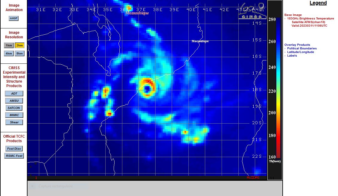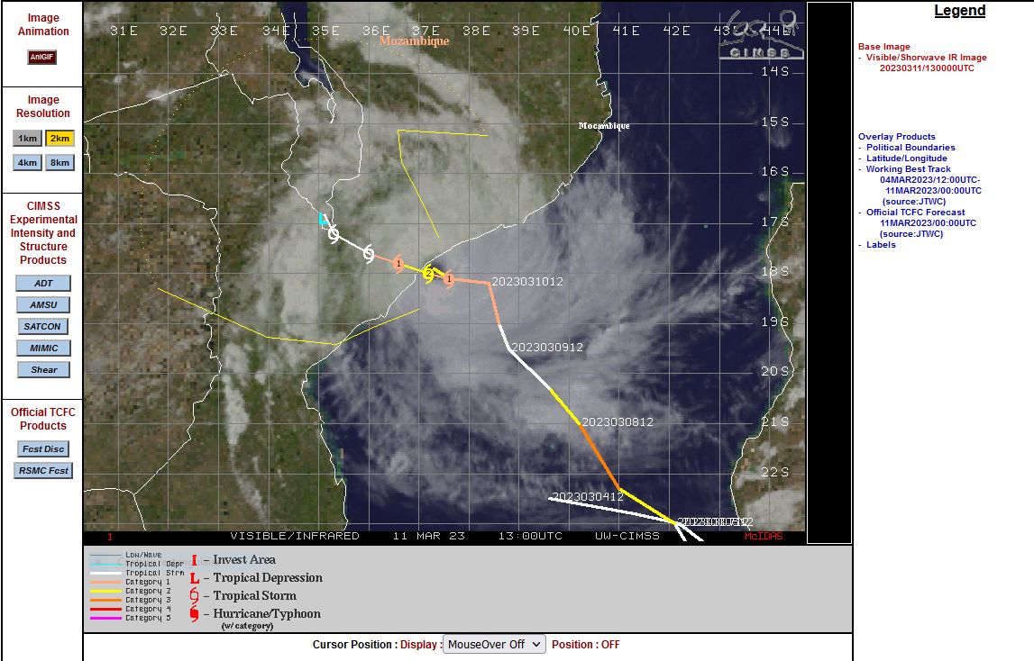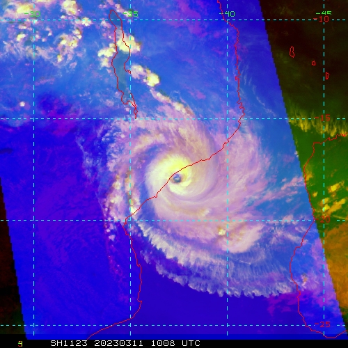 SATELLITE ANALYSIS, INITIAL POSITION AND INTENSITY DISCUSSION: ANIMATED MULTISPECTRAL SATELLITE IMAGERY (MSI) SHOWS THE SYSTEM FURTHER INTENSIFIED AS EVIDENCED BY THE CENTRAL CONVECTION THAT HAS BECOME MORE DENSE AND COMPACT WHILE MAINTAINING A SYMMETRICAL STRUCTURE, TIGHTLY WRAPPED FEEDER BANDS, AND A WELL-DEFINED PINHOLE EYE AS IT IS ABOUT TO MAKE ITS SECONDARY LANDFALL INTO MOZAMBIQUE NEAR QUELIMANE. THE INITIAL POSITION IS PLACED WITH HIGH CONFIDENCE BASED ON THE EYE. THE INITIAL INTENSITY IS ASSESSED BASED ON THE AVERAGE OF AGENCY AND AUTOMATED DVORAK ESTIMATES. ANALYSIS INDICATES THE ENVIRONMENT IS FAVORABLE WITH LOW VWS, WARM SST, AND MODERATE RADIAL OUTFLOW.