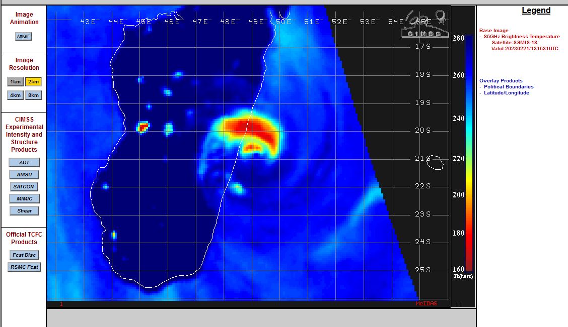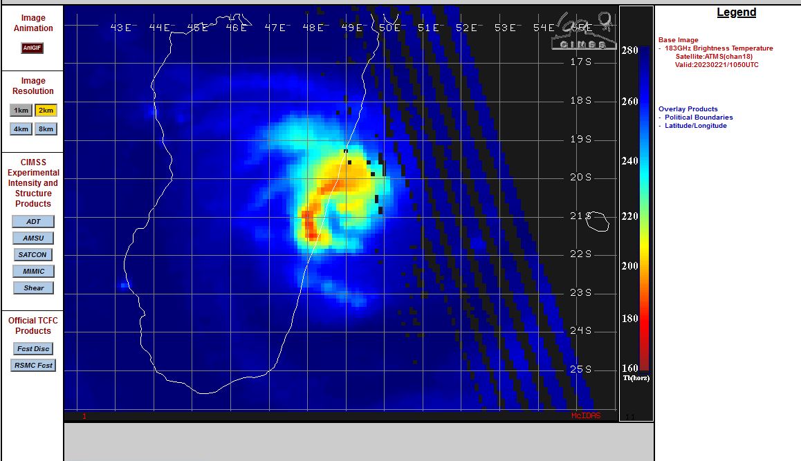 SATELLITE ANALYSIS, INITIAL POSITION AND INTENSITY DISCUSSION: ANIMATED ENHANCED INFRARED (EIR) SATELLITE IMAGERY SHOWS THE SYSTEM REMAINS COMPACT AND SYMMETRICAL WITH A DEFINED 6-NM PINHOLE EYE AS IT IS ABOUT TO MAKE LANDFALL INTO CENTRAL MADAGASCAR. THE EYE HAS SINCE BECOME CLOUD-COVERED AND THE WESTERN HALF OF THE SYSTEM HAS INTRUDED INTO MADAGASCAR WITH EARLY INDICATIONS OF UNRAVELING. THE INITIAL POSITION IS PLACED WITH HIGH CONFIDENCE BASED ON THE EYE FEATURE IN THE EIR LOOP. THE INITIAL INTENSITY IS ALSO ASSESSED WITH HIGH CONFIDENCE BASED ON CLOSELY-CLUSTERED AGENCY AND AUTOMATED DVORAK ESTIMATES AND REFLECTS THE SLIGHT 12-HOUR WEAKENING. THE ENVIRONMENT, FOR NOW, REMAINS FAVORABLE WITH LIGHT VWS, STRONG RADIAL OUTFLOW AND WARM SSTS.
