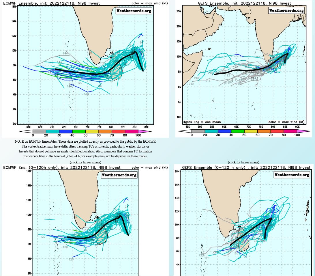 THE AREA OF CONVECTION (INVEST 98B) PREVIOUSLY LOCATED NEAR 7.2N 85.4E IS NOW LOCATED NEAR 9.2N 84.9E, APPROXIMATELY 357 NM SOUTHEAST OF CHENNAI, INDIA. ANIMATED ENHANCED INFRARED SATELLITE IMAGERY (EIR) DEPICTS A BROAD LLC PARTIALLY EXPOSED TO THE SOUTHEAST OF FLARING CONVECTION THAT IS BEING SHEARED TO THE NORTHWEST. ANALYSIS INDICATES 98B IS IN A MARGINALLY FAVORABLE ENVIRONMENT FOR DEVELOPMENT WITH MODERATE TO STRONG (20-25 KNOT) VWS OFFSET BY GOOD DIVERGENCE ALOFT AND WARM (28-29C) SEA SURFACE TEMPERATURES. GLOBAL MODELS ARE IN GOOD AGREEMENT THAT 98B WILL CONTINUE TO TRACK GENERALLY NORTHWARD OVER THE NEXT 24-48 HOURS AND GRADUALLY INTENSIFY; HOWEVER, THE INCREASING VWS WILL LIKELY HINDER DEVELOPMENT INTO A SIGNIFICANT TROPICAL CYCLONE. MAXIMUM SUSTAINED SURFACE WINDS ARE ESTIMATED AT 20 TO 25 KNOTS. MINIMUM SEA LEVEL PRESSURE IS ESTIMATED TO BE NEAR 1006 MB. THE POTENTIAL FOR THE DEVELOPMENT OF A SIGNIFICANT TROPICAL CYCLONE WITHIN THE NEXT 24 HOURS REMAINS LOW.
