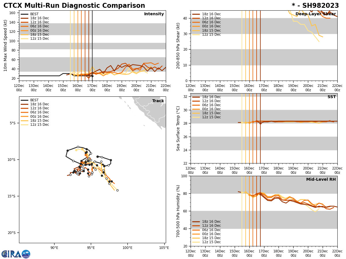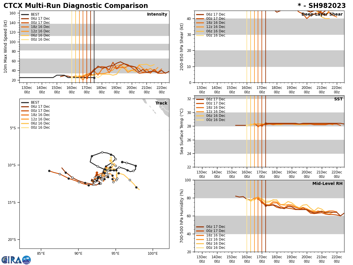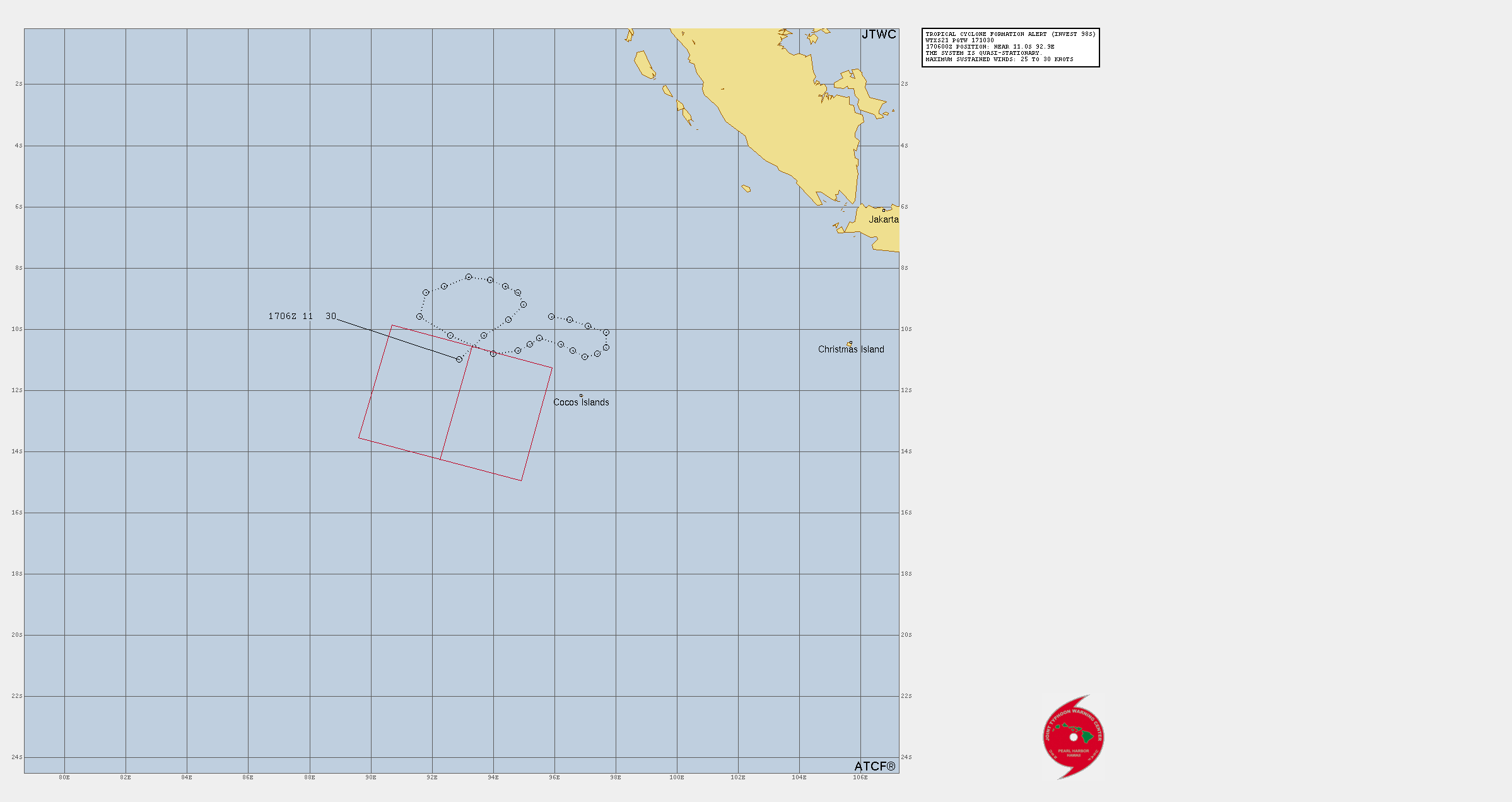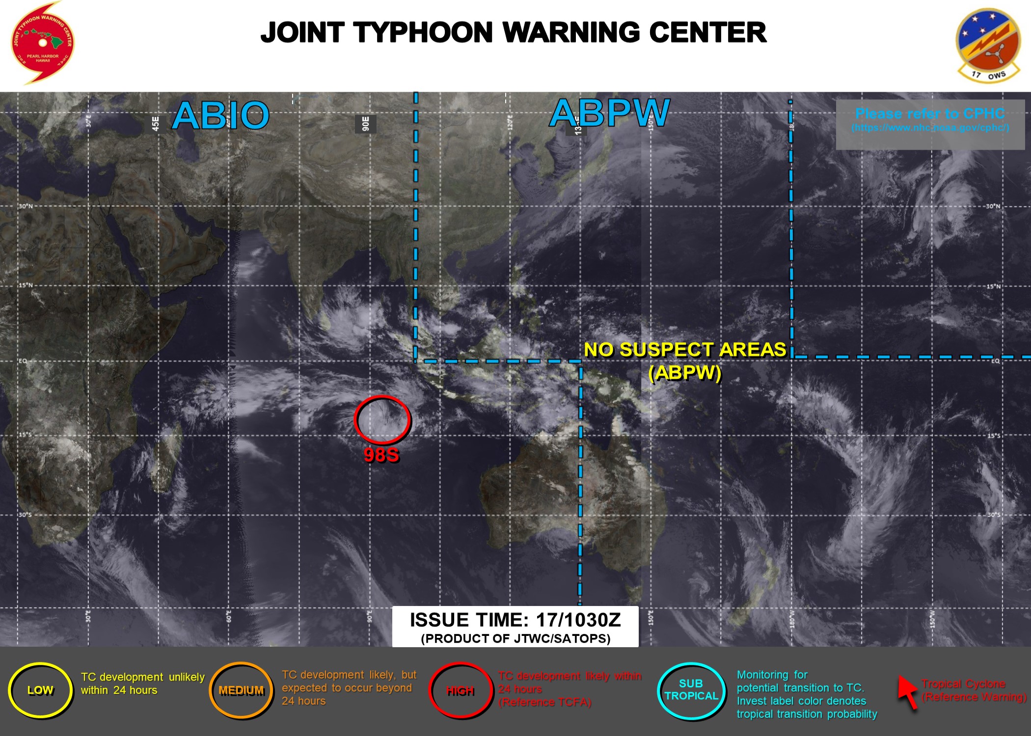 THE AREA OF CONVECTION (INVEST 98S) PREVIOUSLY LOCATED NEAR 11.3S 93.2E IS NOW LOCATED NEAR 11.9S 93.1E, APPROXIMATELY 220 NM WEST OF COCOS ISLANDS, AUSTRALIA. ENHANCED INFRARED (EIR) SATELLITE IMAGERY AND A 171549Z ASCAT-C PASS REVEAL A CONSOLIDATING AREA OF DEEP CONVECTION WRAPPING AROUND A LOW-LEVEL CIRCULATION CENTER (LLCC) WITH 20 TO 25 KNOT WINDS. ENVIRONMENTAL ANALYSIS INDICATES MARGINALLY FAVORABLE CONDITIONS FOR DEVELOPMENT WITH MODERATE (15-20KTS) VWS AND MODERATE (28- 29C) SSTS WITH AN UPPER-LEVEL POINT SOURCE ENHANCING RADIAL OUTFLOW ALOFT. GLOBAL MODELS ARE IN GOOD AGREEMENT THAT INVEST 98S WILL CONTINUE TO GRADUALLY DEEPEN AND DEVELOP OVER THE NEXT 24-48 HOURS. MAXIMUM SUSTAINED SURFACE WINDS ARE ESTIMATED AT 20 TO 25 KNOTS. MINIMUM SEA LEVEL PRESSURE IS ESTIMATED TO BE NEAR 1000 MB. THE POTENTIAL FOR THE DEVELOPMENT OF A SIGNIFICANT TROPICAL CYCLONE WITHIN THE NEXT 24 HOURS REMAINS HIGH.