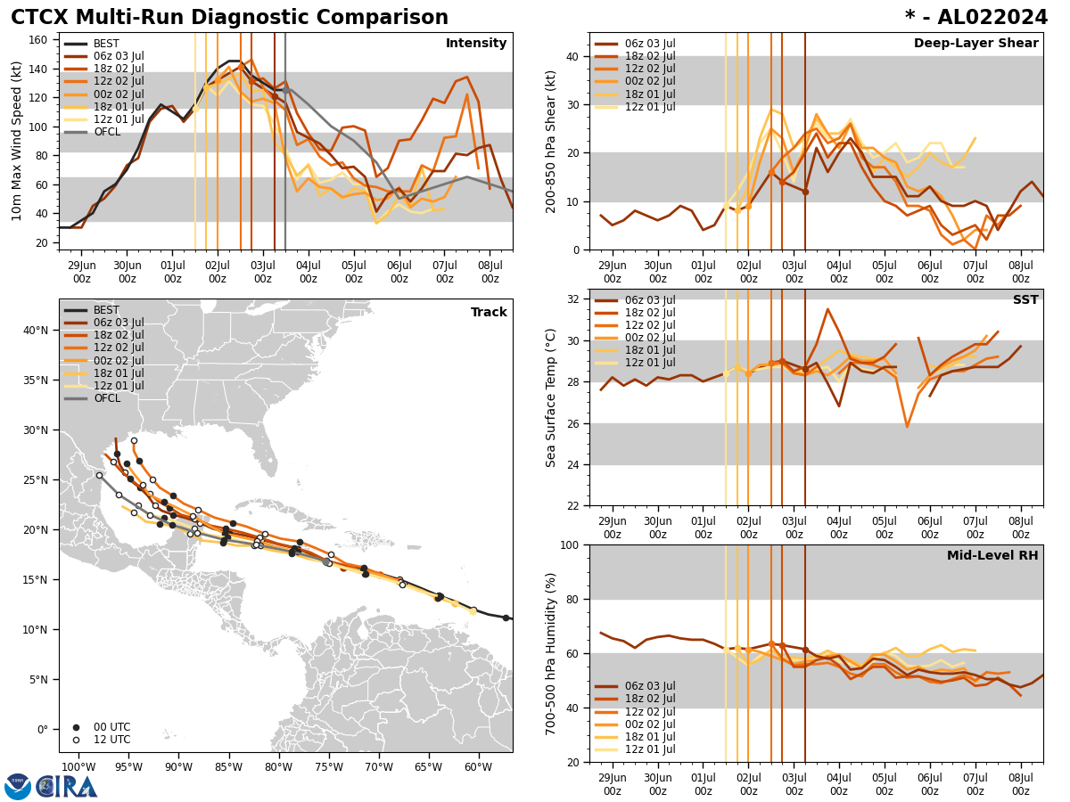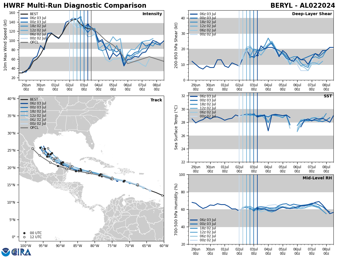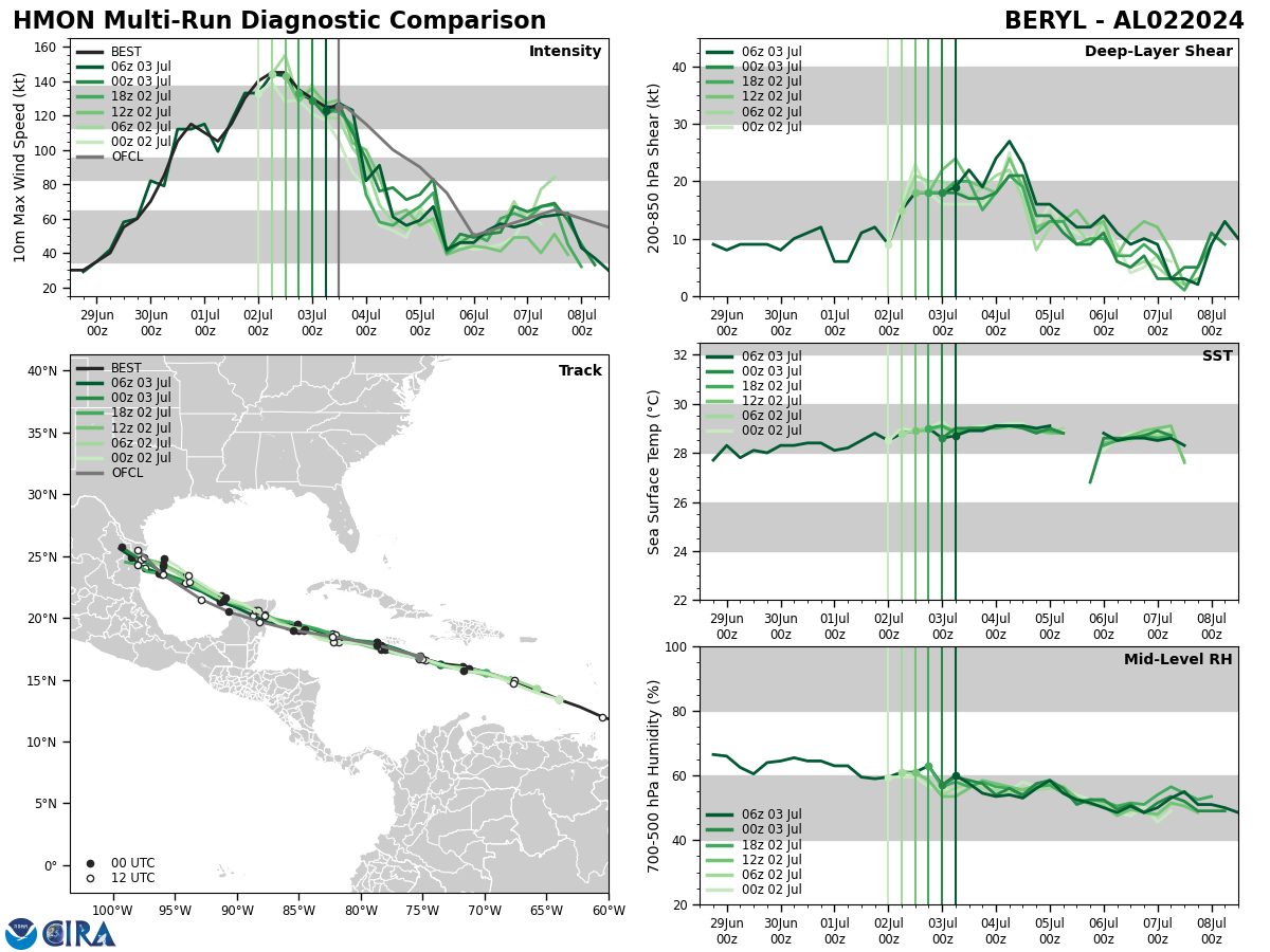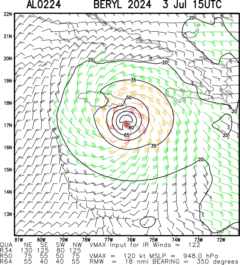 NORTH ATLANTIC OCEAN: HU 02L(BERYL). ESTIMATED LOCATION AND INTENSITY AT 03/12UTC. INTENSITY IS 125 KNOTS/CAT 4 US: -20 KNOTS OVER 24H