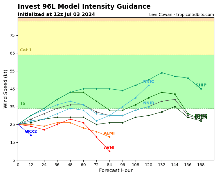 NORTH ATLANTIC OCEAN: INVEST 96L. ESTIMATED LOCATION AND INTENSITY AT 03/12UTC. INTENSITY IS 25 KNOTS