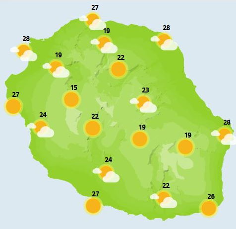 DIMANCHE 07 Au lever du jour, bonne surprise le ciel se montre clément, l'ensemble de la Réunion se réveille sous le soleil avec un petit bémol au pied du Volcan où quelques nuages peuvent donner une petite averse . Au fil des heures, les nuages commencent à s'accrocher sur les pentes du relief mais les plus hauts sommets devraient rester au dessus des nuages. L'après-midi, les Cirques et les plaines s'ennuagent, les nuages débordent ensuite en direction de l'ouest avec deux trois gouttes possibles sur le quart nord-ouest mais rien de bien méchant. Les plus hauts sommets restent au soleil. Les températures sont en légère hausse par rapport à la veille, elles gagnent de 1 à 2 degrés par rapport à la veille. Le vent de secteur Sud-Est est modéré sur le sud-ouest et nord-est avec quelques rafales vers Saint Pierre. Vent faible sur les plages de l'Ouest. La mer est peu agitée à agitée.