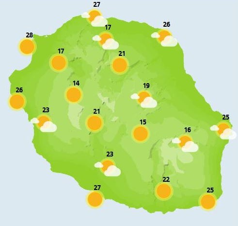 JEUDI 28 Très belle journée chaude et sèche. Il faudra bien en profiter. Activités de plein air recommandées notamment en montagne avec des sommets et des Cirques bien dégagés. Les nuages se concentrent l'après-midi dans le sud sans précipitations. Le vent de Nord est soutenu sur Saint-Gilles, La Possession, Saint-Paul, mais aussi vent Sainte-Rose les rafales atteignent 60 km/h. Mer encore relativement calme malgré le vent. Les températures restent chaudes pour la saison. VENDREDI 29 Changement radical de temps, un front actif venant de l'ouest traverse la Réunion de part en part en matinée en donnant de bonnes pluies, surtout dans le nord et l'ouest. Orages non exclus en début d'épisode. L'après-midi, le ciel reste couvert mais les pluies se sont atténuées. Le vent de Nord en début de journée passe au Nord-Ouest l'après-midi puis Ouest en soirée. Fortes rafales à prévoir au passage du front le matin, 70 à 80 km/h en cas d'orages. Températures forcément en baisse la journée sous ce temps humide. Arrivée d'une houle australe entre 2 m et 2 m 50 l'après-midi s'amplifiant la nuit suivante et samedi. JEUDI 28 Très belle journée chaude et sèche. Il faudra bien en profiter. Activités de plein air recommandées notamment en montagne avec des sommets et des Cirques bien dégagés. Les nuages se concentrent l'après-midi dans le sud sans précipitations. Le vent de Nord est soutenu sur Saint-Gilles, La Possession, Saint-Paul, mais aussi vent Sainte-Rose les rafales atteignent 60 km/h. Mer encore relativement calme malgré le vent. Les températures restent chaudes pour la saison. VENDREDI 29 Changement radical de temps, un front actif venant de l'ouest traverse la Réunion de part en part en matinée en donnant de bonnes pluies, surtout dans le nord et l'ouest. Orages non exclus en début d'épisode. L'après-midi, le ciel reste couvert mais les pluies se sont atténuées. Le vent de Nord en début de journée passe au Nord-Ouest l'après-midi puis Ouest en soirée. Fortes rafales à prévoir au passage du front le matin, 70 à 80 km/h en cas d'orages. Températures forcément en baisse la journée sous ce temps humide. Arrivée d'une houle australe entre 2 m et 2 m 50 l'après-midi s'amplifiant la nuit suivante et samedi. JEUDI 28 Très belle journée chaude et sèche. Il faudra bien en profiter. Activités de plein air recommandées notamment en montagne avec des sommets et des Cirques bien dégagés. Les nuages se concentrent l'après-midi dans le sud sans précipitations. Le vent de Nord est soutenu sur Saint-Gilles, La Possession, Saint-Paul, mais aussi vent Sainte-Rose les rafales atteignent 60 km/h. Mer encore relativement calme malgré le vent. Les températures restent chaudes pour la saison. VENDREDI 29 Changement radical de temps, un front actif venant de l'ouest traverse la Réunion de part en part en matinée en donnant de bonnes pluies, surtout dans le nord et l'ouest. Orages non exclus en début d'épisode. L'après-midi, le ciel reste couvert mais les pluies se sont atténuées. Le vent de Nord en début de journée passe au Nord-Ouest l'après-midi puis Ouest en soirée. Fortes rafales à prévoir au passage du front le matin, 70 à 80 km/h en cas d'orages. Températures forcément en baisse la journée sous ce temps humide. Arrivée d'une houle australe entre 2 m et 2 m 50 l'après-midi s'amplifiant la nuit suivante et samedi.