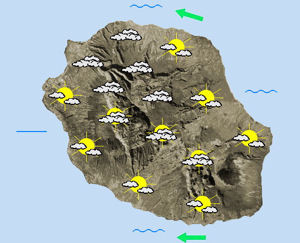 JOURNEE DU MERCREDI 27 Alizé modéré associé à une atmosphère peu humide. Au lever du jour, le temps est plutôt clément sur la majeure partie du département, même si quelques entrées maritimes accompagnées de petites gouttes se manifestent sur la façade Est. En matinée, les nuages commencent à se former le long des pentes. Au fil des heures, la couverture nuageuse se densifie dans l'intérieur laissant les plus hauts sommets dégagés. L'après-midi, les nuages débordent temporairement sur les régions du Sud-Ouest apportant un peu d'ombre. De belles périodes ensoleillées résistent sur les zones ventilées, littoral Nord et Sud Sauvage notamment. Aux heures les plus chaudes de la journée, on relève 27 à 30°C sur le littoral, 23 à 25°C dans les cirques et 18 à 20°C au Maïdo et au volcan. Le vent souffle en rafales sur la côte Sud, de Saint-Philippe à Saint-Joseph, en baie de la Possession et de la Pointe des Galets à la Pointe des Aigrettes avec des rafales de 50 à 60 km/h. La façade Ouest reste sous l'emprise des brises. La mer est agitée mais localement forte vers le Sud Sauvage où les deux houles proches de 2 mètres, houle d'alizé et houle australe, se croisent.
