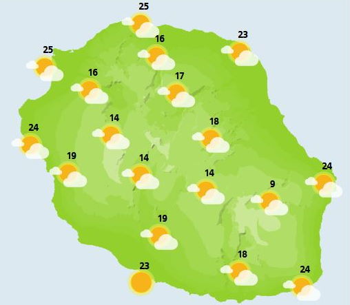JEUDI 04 Net changement de temps avec une atmosphère beaucoup plus sèche. C'est donc une belle journée qui nous attend avec un grand soleil matinal et des nuages peu épais présents l'après-midi à mi-pentes. Les éclaircies restent majoritaires sur le littoral à l'exception de quelques débordements en fin d'après-midi vers Saint-Denis et la Possession. Au Piton-Maïdo et au volcan, le soleil brille sans discontinuité du matin au soir. Peu ou pas de vent sur l'ensemble de l'île, tant sur la côte que dans les hauts. Ces conditions sont propices à une hausse sensible des températures qui flirtent avec les 30°C sur les plages de l'Ouest, 24°C dans les cirques et dépassent 20°C au volcan. La mer demeure peu agitée à agitée.
