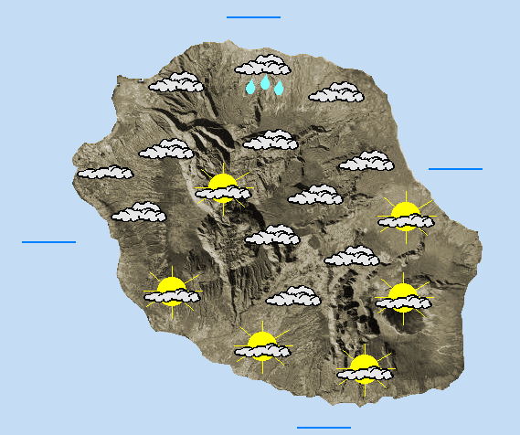 JOURNEE DU MERCREDI 03 Vent faible sur le département dans un environnement calme. La matinée débute avec une Réunion coupée en deux. En effet un soleil généreux brille sur les régions de l'Ouest et du Sud-Ouest. Sur la côte Est, nuages et soleil se partagent le ciel, avec un risque de petites pluies qui s'atténue par rapport au lever du jour. Au fil des heures, les nuages prennent possession de l'intérieur de l'île. L'après midi, la couverture nuageuse est bien marquée sur les reliefs. De rares averses se produisent sur les hauteurs du Nord de préférence ainsi que sur les hauts de l'Ouest. Les sommets au dessus de 1500 à 1600 mètres profitent de belles trouées de ciel bleu. Le littoral devra composer avec un ciel relativement nuageux mais sans donner de précipitations. Le vent est faible, c'est un régime de brises qui prédominent avec une composante Nord-Est prise par le vent sur le Port. Au plus chaud de cette journée, les thermomètres affichent 25 à 29°C sur le littoral, 22 à 24°C dans les cirques et flirtent avec les 18°C au Pas de Bellecombe-Jacob. La mer est peu agitée à agitée. Une petite houle de Sud déferle sur la côte Ouest et une petite houle d'alizé est observée sur la côte Est.