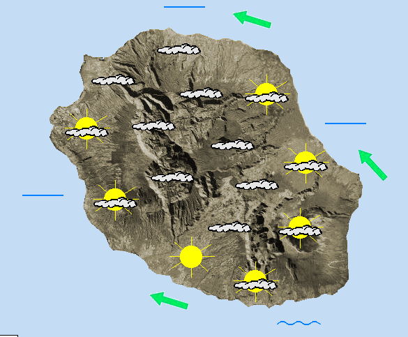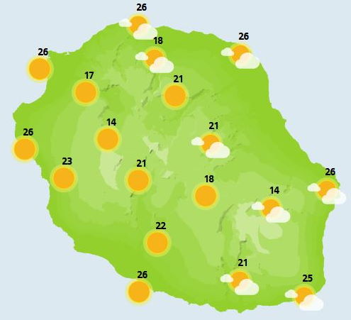 LUNDI 01 Au petit matin, réveil ensoleillé sur la majeure partie de l'île mais temps gris et humide de Sainte-Rose à Saint-Joseph. Ensuite, les éclaircies s'effacent progressivement pour faire place à une ambiance plus nuageuse dans les hauts. Ce temps nuageux dans l'intérieur est encore propice à de petites averses éparses dans l'intérieur de l'île. Les éclaircies résistent tout de même sur le littoral Ouest et Sud-Ouest ainsi que sur les plus hauts sommets, Piton des Neiges, Piton-Maïdo et volcan. Les côtes sont soumises à un faible alizé de Sud-Est alors qu'un vent de secteur Ouest prédomine sur les sommets. Les températures évoluent peu avec 25 à 28 °c sur le littoral, 19 à 21 °c dans les cirques et 18 °c au Volcan. Côté mer, elle est peu agitée à agitée au déferlement d'une petite houle de secteur sud.