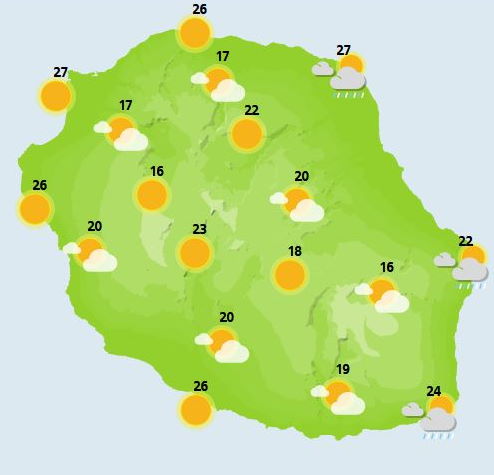 RÉUNION. Mardi matinée/Carte: MTOTEC/ Bulletin Prévisions MF OI. En pièce jointe la carte de MF OI avec notamment les températures( cliquez sur AM) ci-dessous.