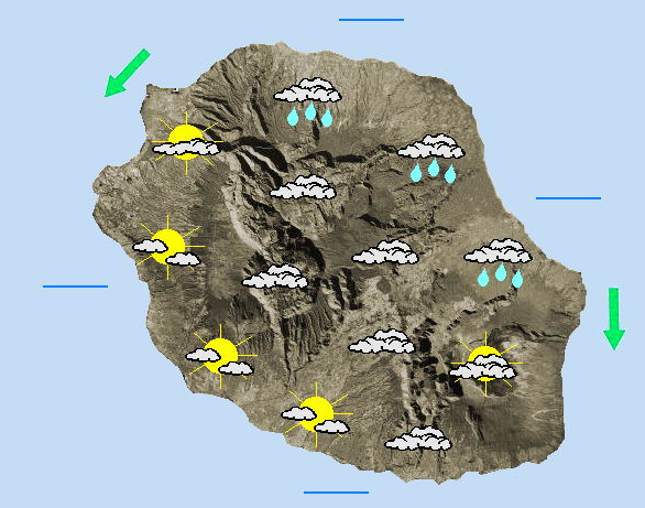 JOURNEE DU MARDI 02 Temps calme mais relativement humide associé à un faible flux de secteur Est. Le vent est faible, le ciel est nuageux et les températures sont légèrement en-dessous de la normale saisonnière. Même si à l'ouest de l'île , le réveil se fait au soleil, à l'Est le ciel est couvert. Le littoral Est allant de Saint-André à Saint-Philippe est l'objet d'averses faibles parfois modérées. L'évolution notable de ce matin, c'est le développement rapide d'une couverture nuageuse sur l'ouest de l'île. Les plages de l'ouest gardent des éclaircies le matin mais cela ne dure pas. L'après-midi, cette couverture nuageuse se densifie ert des averses localisées et isolées se déclenchent sur les pentes. La localisation de ces averses se fait sur les pentes de l'île dans l'intérieur. Ces averses isolées ont une préférence pour les les pentes du Nord du côté du Brûlé et du Colorado. Sur l'ouest, ces averses toujours isolées générent un temps maussde dans la région du Tampon, de Bois de Nèfles Saint-Paul, et de la Possession .... Les brises sont majoritaires mais le vent de secteur Est devient temporairement sensible sur le littoral avec des pointes à 50 km/h. Au plus chaud de cette journée, les thermomètres affichent 25 à 28°C sur le littoral, 22 à 24°C dans les cirques et flirtent avec les 18°C au Pas de Bellecombe-Jacob. L'état de la mer est stationnaire. Elle reste agitée de la Pointe des Aigrettes à la Pointe des cascades, au déferlement d'une petite houle de secteur Sud qui s'amortit sous 1 mètre 50, et belle à peu agitée ailleurs.