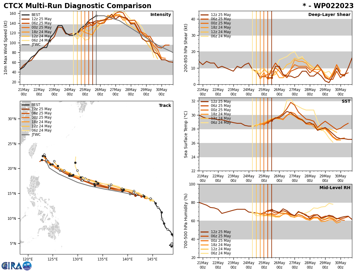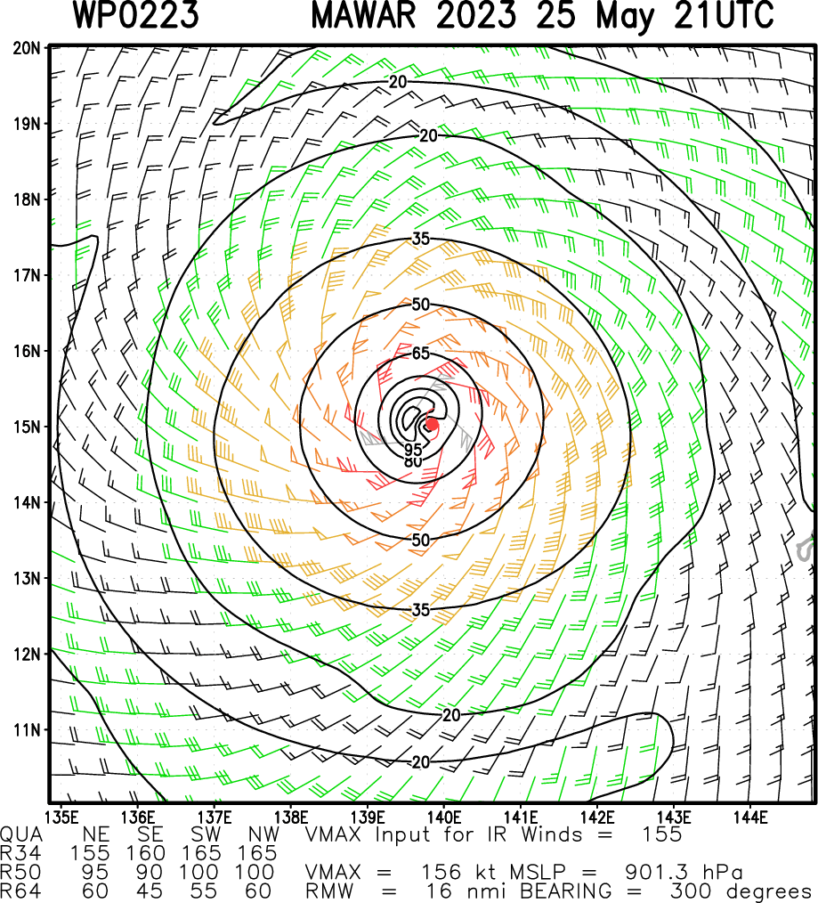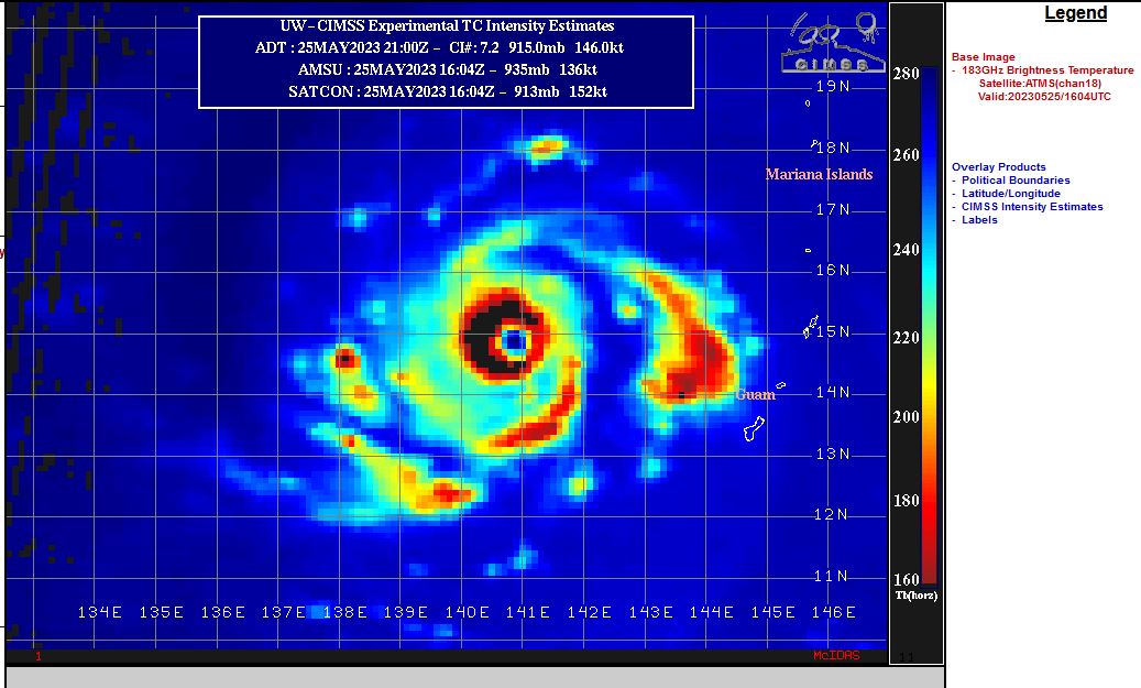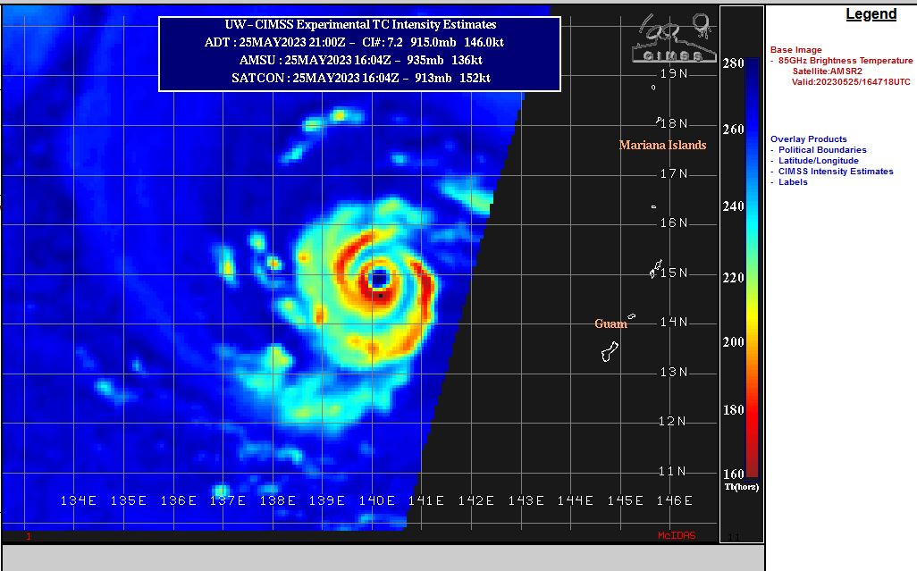 WESTERN NORTH PACIFIC: SUPER TY 02W(MAWAR). CURRENT ESTIMATED INTENSITY IS 155 KNOTS(CAT 5 US) AT 25/18UTC: +25 KNOTS OVER 24HOURS.
