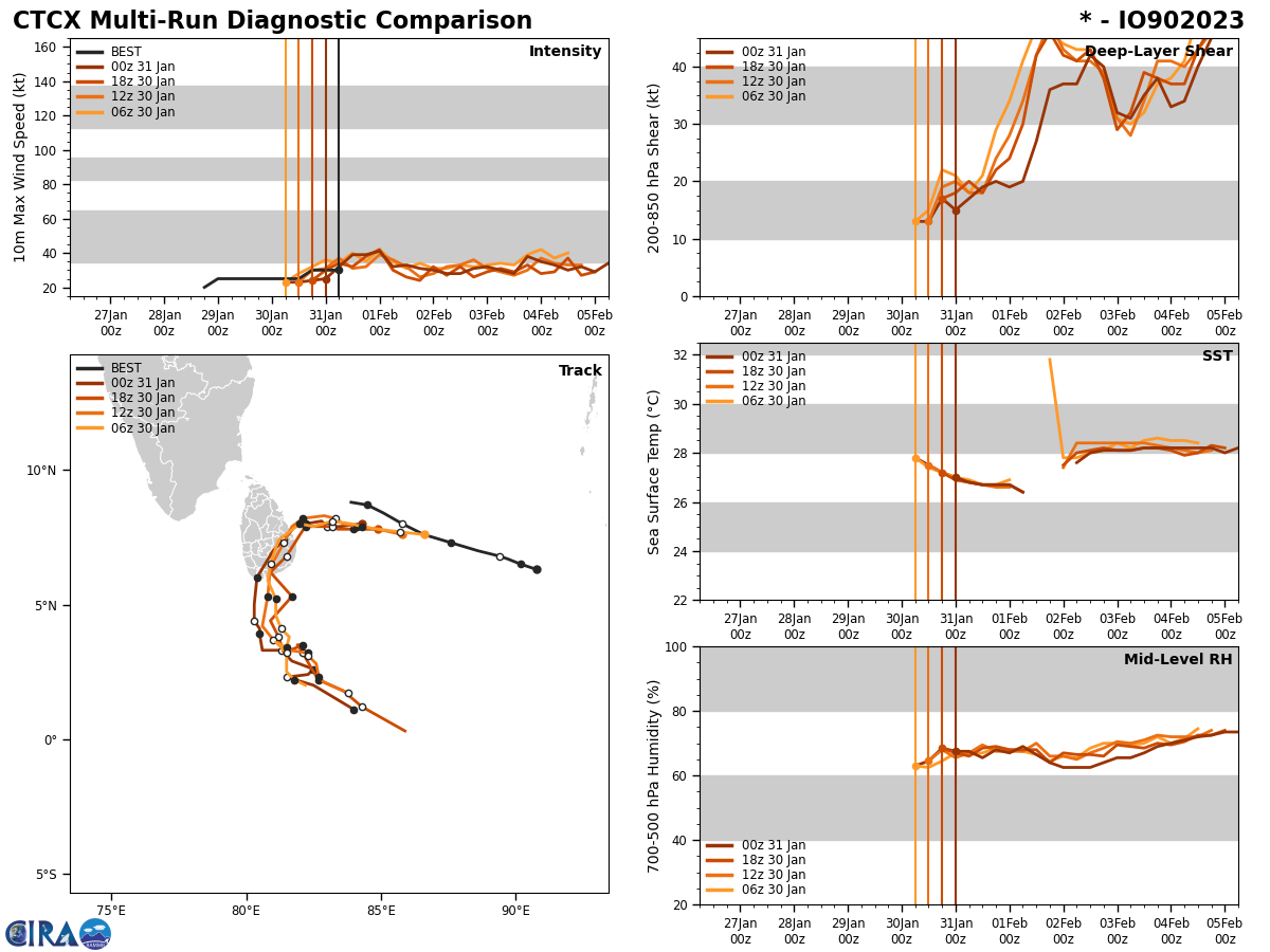 THE AREA OF CONVECTION (INVEST 90B) PREVIOUSLY LOCATED NEAR 7.2N 82.9E IS NOW LOCATED NEAR 8.5N 84.5E, APPROXIMATELY 291.7 NM EAST-NORTHEAST OF COLOMBO, SRI LANKA. ANIMATED ENHANCED INFRARED SATELLITE IMAGERY AND A 302221Z SSMIS 91GHZ MICROWAVE PASS SHOWS FLARING CONVECTIVE BANDS WRAPPING INTO A FULLY OBSCURED, GRADUALLY CONSOLIDATING LLCC. ENVIRONMENTAL ANALYSIS REVEALS MARGINALLY FAVORABLE CONDITIONS FOR INTENSIFICATION AS INDICATED BY LOW TO MODERATE (15-20KT) VERTICAL WIND SHEAR, OFFSET BY WARM (28-29C) SST, IMPROVED POLEWARD OUTFLOW AND A FAVORABLE MJO SIGNAL WHICH WILL CONTINUE TO ENHANCE CONVECTIVE DEVELOPMENT OVER THE REGION. GLOBAL MODELS ARE IN AGREEMENT THAT 90B WILL CONTINUE WEST AND MAKE LANDFALL OVER SRI LANKA WITHIN 36 HOURS. DESPITE THE MARGINALLY FAVORABLE ENVIRONMENT, THERE REMAINS A LOW PROBABILITY THAT THE SYSTEM COULD REACH TROPICAL STORM STRENGTH PRIOR TO LANDFALL. MAXIMUM SUSTAINED SURFACE WINDS ARE ESTIMATED AT 25 TO 30 KNOTS. MINIMUM SEA LEVEL PRESSURE IS ESTIMATED TO BE NEAR 1004 MB. THE POTENTIAL FOR THE DEVELOPMENT OF A SIGNIFICANT TROPICAL CYCLONE WITHIN THE NEXT 24 HOURS IS UPGRADED TO HIGH.