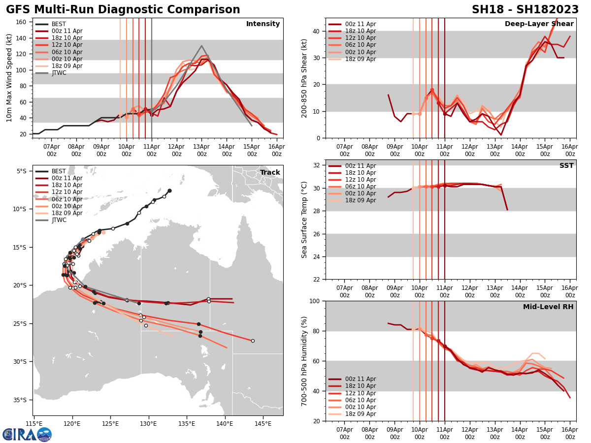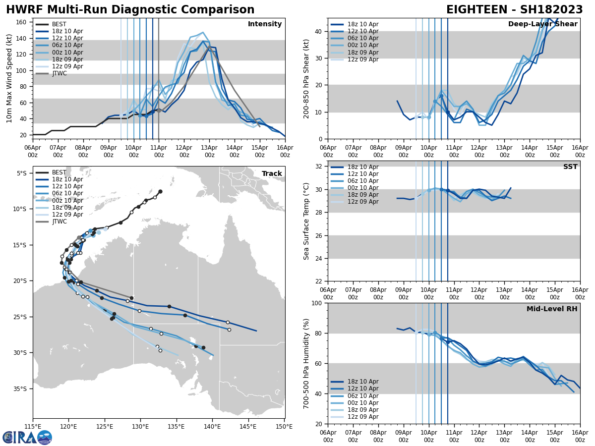 FORECAST REASONING. SIGNIFICANT FORECAST CHANGES: THERE ARE NO SIGNIFICANT CHANGES TO THE FORECAST FROM THE PREVIOUS WARNING. FORECAST DISCUSSION: TC 18S IS RIDING THE NORTHWESTERN PERIPHERY OF THE SUBTROPICAL RIDGE TO THE EAST. AS IT CONTINUES THIS TRAJECTORY, THE SYSTEM WILL INTENSIFY AS THE VWS IS EXPECTED TO LOWER THROUGHOUT THE FORECAST PERIOD. BY TAU 12, THE INTENSITY WILL INCREASE TO 60 KTS, AND THEN FURTHER INCREASING TO 80 KTS BY TAU 24. BY TAU 36, TC 18S WILL BEGIN TO ROUND THE RIDGE AXIS AND SHIFT TO A MORE SOUTHWARD TRACK WHILE IT JUMPS UP TO 105 KTS. UPON COMPLETION OF ROUNDING THE RIDGE AXIS, THE SYSTEM WILL BEGIN A SOUTHEASTWARD TRAJECTORY AND REACH ITS MAX INTENSITY OF 130 KTS. AS TC 18S MAKES ITS APPROACH TO LAND, IT WILL PASS OVER A POOL OF WARMER (30-31 C) SSTS, CONTRIBUTING TO MAINTAINING ITS INTENSITY AS IT PICKS UP TRACK SPEED. JUST AFTER TAU 60, TC 18S WILL MAKE LANDFALL ALMOST AT THE CENTER POINT OF EIGHTY MILE BEACH, AUSTRALIA. AFTER A PERIOD OF LAND INTERACTION, THE SYSTEM WILL BEGIN ITS DISSIPATION PHASE AND DECREASE TO 75 KTS BY TAU 72, FURTHER DECREASING AND BECOME FULLY DISSIPATED BY TAU 96.