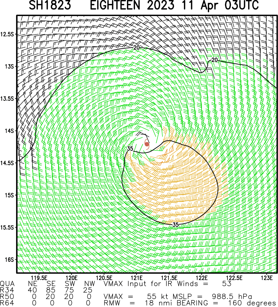 SOUTH INDIAN OCEAN/WESTERN AUSTRALIA: TC 18S. CURRENT ESTIMATED INTENSITY IS 50 KNOTS AT 11/00UTC.
