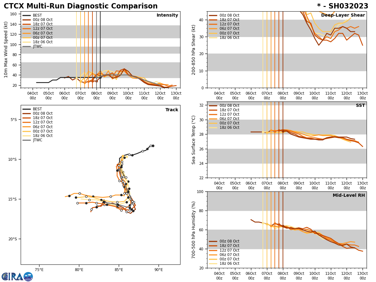 MODEL DISCUSSION: NUMERICAL MODEL GUIDANCE IS IN FAIR AGREEMENT ABOUT THE OVERALL TRAJECTORY OF 03S THOUGH CROSS TRACK AND ALONG TRACK VARIABILITY DOES INCREASE WITH TIME. NAVGEM IS A CLEAR SOUTHERLY OUTLIER WITH THE BULK OF THE GUIDANCE INDICATING A 150NM WIDE SPREAD AS VARIOUS MODELS EXECUTE THE WESTWARD TURN, AFTER WHICH ALONG TRACK SPREAD BECOMES DOMINATE. FOR THESE REASONS THE JTWC FORECAST TRACK IS PLACED WITH MEDIUM CONFIDENCE. RELIABLE MODEL INTENSITY GUIDANCE IS IN GOOD AGREEMENT WITH THE JTWC FORECAST INTENSITY. ALL MEMBERS INDICATE THAT 03S WILL BRIEFLY INTENSIFY FOLLOWED BY A STAGNATION PERIOD AND FINALLY WEAKENING UNTIL DISSIPATION. AS A RESULT THE JTWC FORECAST INTENSITY IS PLACED WITH HIGH CONFIDENCE.
