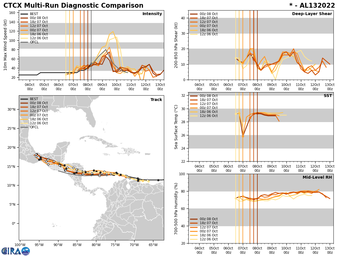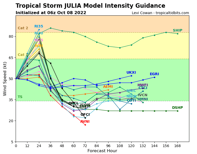 WTNT43 KNHC 080852 TCDAT3 Tropical Storm Julia Discussion Number 8 NWS National Hurricane Center Miami FL AL132022 500 AM EDT Sat Oct 08 2022 Julia is a strengthening tropical cyclone. Satellite imagery has shown an increase in persistent and deep convection occurring over the center, with an expanding area of cloud top temperatures colder than -80 deg C. Overnight data from the Air Force Hurricane Hunters indicated the vertical structure of Julia is still organizing, with evidence of multiple low-level centers noted in the 850-mb flight level wind data. But, the aircraft reported flight-level winds of 59 kt and believable SFMR retrievals of 45-50 kt on its last pass through the northeastern quadrant of the cyclone. Based on these data, the initial intensity is set at 50 kt for this advisory. Weak deep-layer shear, abundant mid-level moisture, and SSTs around 29.5 degrees Celsius appear conducive for steady to rapid intensification of Julia during the next 24 h as it approaches Central America. In fact, the SHIPS Rapid Intensification Index shows a 63 percent chance of a 30 kt increase in intensity during the next 24 h. Given the strengthening noted tonight and the improved satellite structure, the NHC forecast calls for Julia to rapidly intensify into a hurricane later today and continue strengthening through landfall on Sunday. This forecast lies between the multi-model consensus aids and the stronger SHIPS and LGEM guidance. After landfall, the cyclone is forecast to weaken as it moves across the terrain of Central America. The estimated initial motion is westward at 265/16 kt. Julia is expected to continue moving quickly westward for the next day or so along the southern periphery of a strong mid-level ridge to its north. This motion should bring the center of Julia near San Andres and Providencia Islands this evening and over the coast of Nicaragua within the warning area early Sunday. Based on a southward shift in the track guidance, the NHC forecast has been adjusted in that direction to bring it closer to the multi-model consensus. As a result, the government of Nicaragua has extended Hurricane and Tropical Storm Warnings southward along the coast. There is still above average uncertainty regarding the future of Julia after landfall. While some models (HWRF, HMON, GFS) show the center largely remaining over land and dissipating, others (ECMWF and UKMET) show low-level vorticity associated with Julia or its remnants emerging over the eastern Pacific waters early next week. While it appears unlikely that the surface circulation would survive the topography of Nicaragua, this scenario could become more likely if there are additional southward adjustments to the track. For now, the NHC forecast shows weakening and dissipation by 72 h near the coast of Central America, but interests along the Pacific coasts of El Salvador, Honduras, and Nicaragua should monitor forecast updates. Regardless, the set up is likely to lead to heavy rains over Central America for several days, which could cause life-threatening flash floods and mudslides, especially in areas of mountainous terrain. Key Messages: 1. Julia is forecast to strengthen into a hurricane later today, and a Hurricane Warning is in effect for portions of the Nicaragua coast and the islands of Providencia and San Andres. Hurricane-force winds and a dangerous storm surge are expected in areas where the core of the system crosses the islands tonight and moves onshore in Nicaragua on Sunday. 2. Life-threatening flash flooding and mudslides are expected across portions of Central America this weekend. Flash flooding is possible across the Isthmus of Tehuantepec in Mexico early next week.