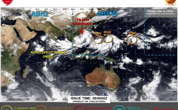 Western Pacific: TS 22W(LIONROCK) making landfall over Hainan/ busy too with 3 Invest areas East of the Philippines, 08/03utc - 10/08/2021 - 05:50