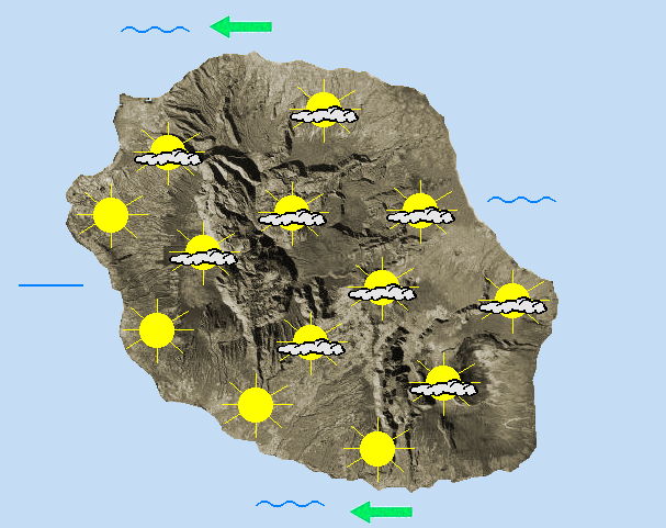 MARDI 19 Quelques entrées maritimes sont possibles sur la façade Est de l'île en tout début de journée mais partout ailleurs le soleil règne en maître. Les nuages présents en cours de journée sont peu épais et ne résistent guère à l'ardeur du soleil qui s'impose sur la majorité de l'île et notamment sur les sommets comme au Piton des neiges, au Maïdo et au volcan. L'alizé est peu véloce et souffle modérément sur le littoral Nord ainsi que le long du Sud sauvage. Ailleurs, les brises sont bien en place toute la journée. Les thermomètres flirtent avec les 30°C sur le littoral Ouest, 24°C dans les cirques et dépassent 18°C au volcan. Côté océan, il faut seulement noter la présence d'une petite houle d'alizé de l'ordre de 1 mètre 50 à 2 mètres. MERCREDI 20 Après une matinée assez lumineuse, le ciel s'ennuage dans l'intérieur au fil de la matinée et quelques averses de faible intensité se déclenchent alors dans les hauts l'après-midi. L'inversion remonte vers 2000m et laisse encore les plus hauts sommets dégagés. Le vent d'Est est plus faible que la veille et les brises sont alors prédominantes en journée. La mer est agitée avec l'arrivée d'une houle australe entre 1 mètre 50 et 2 mètres ressentie du Sud de la Pointe des Aigrettes jusqu'à la Pointe de la Table en passant par Saint-Pierre.
