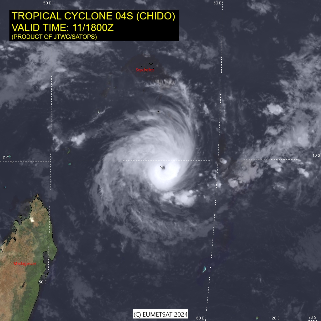 SATELLITE ANALYSIS, INITIAL POSITION AND INTENSITY DISCUSSION: TROPICAL CYCLONE (TC) 04S (CHIDO) HAS BEEN OBSERVED TO UNDERGO EXTREME RAPID INTENSIFICATION OVER THE PREVIOUS 24 HOURS, INCREASING FROM AN INTENSITY OF 75 KTS TO 135 KTS OVER THE LAST DAY. ANIMATED ENHANCED INFRARED (EIR) SATELLITE IMAGERY DEPICTS AN IMPRESSIVE CYCLONE, WITH A 12 NM WIDE EYE-FEATURE, SURROUNDED BY CONTINUOUS DEEP CONVECTION WRAPPING VERY TIGHTLY AROUND THE LOW-LEVEL CIRCULATION CENTER (LLCC). EIR IMAGERY HAS CONTINUED TO SHOW A VERY SYMMETRIC AND MODERATELY SIZED TC, WITH MINIMAL CONVECTIVE BANDS OUTSIDE OF THE TIGHTLY WRAPPED STRUCTURE. ON ANIMATED WATER VAPOR (WV) IMAGERY, STRONG RADIAL OUTFLOW ALOFT HAS BEEN OBSERVED OVER THE LAST 12 HOURS, CHARACTERIZED BY VISIBLE CIRRIFORM STRIATIONS BURSTING OUTWARD FROM THE IMMEDIATE CENTER. WITH REGARD TO THE ENVIRONMENT, VERTICAL WIND SHEAR (VWS) HAS REMAINED LOW (10-15 KTS) OVER THE PREVIOUS SIX HOURS, WHILE SEA SURFACE TEMPERATURES (SST) MAINTAIN A SUPPORTIVE 27-28 C. THE INITIAL POSITION IS PLACED WITH HIGH CONFIDENCE BASED ON THE WELL-DEFINED AND OBSERVABLE EYE-FEATURE ON ANIMATED EIR IMAGERY. THE INITIAL INTENSITY IS ASSESSED WITH MEDIUM CONFIDENCE BASED ON SUBJECTIVE AGENCY ESTIMATES RANGING BETWEEN 127 KTS AND 140 KTS, WHILE CIMSS OBJECTIVE ESTIMATES HAVE SHOWN A CEILING OF 136 KTS AT 120600Z.