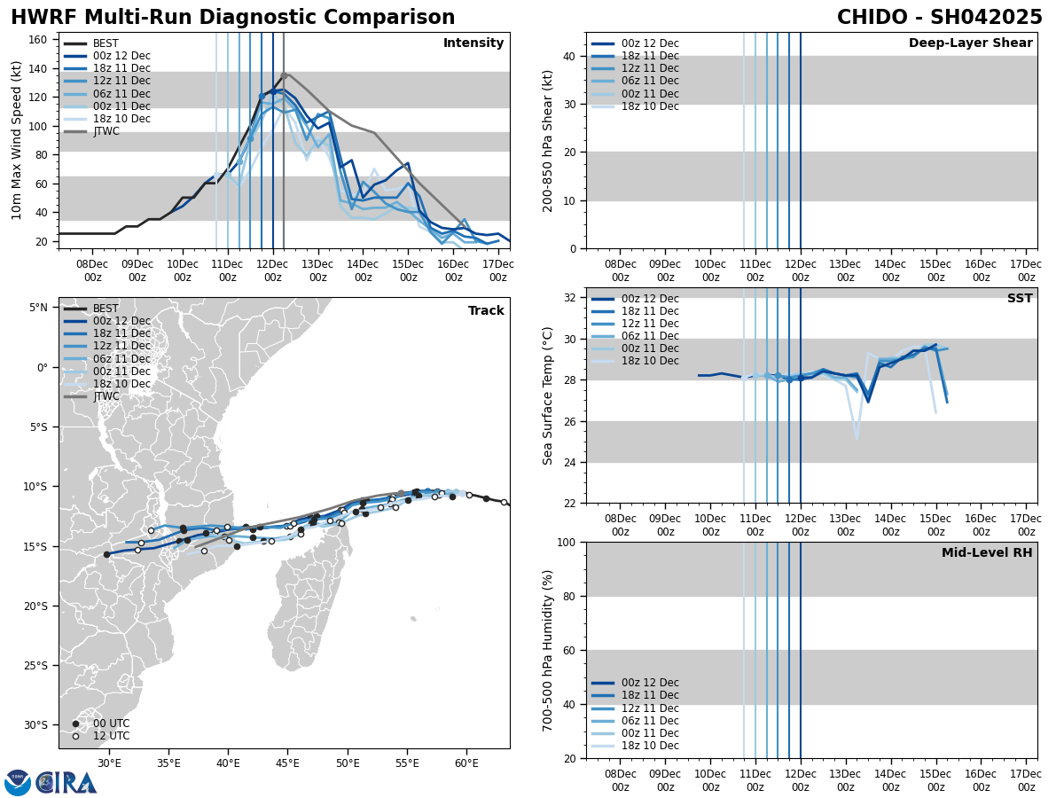 FORECAST REASONING. SIGNIFICANT FORECAST CHANGES: CURRENT INTENSITY EXCEEDS PREVIOUSLY EXPECTED INTENSITY BY 10 KTS. THERE ARE NO OTHER SIGNIFICANT CHANGES FROM THE PREVIOUS FORECAST. FORECAST DISCUSSION: TC 04S IS FORECASTED TO CONTINUE TRACKING GENERALLY WEST-SOUTHWESTWARD ALONG THE NORTHWESTERN PERIPHERY OF A SUBTROPICAL RIDGE LOCATED DIRECTLY TO THE SOUTH. BETWEEN TAU 24 AND TAU 36, CHIDO IS EXPECTED TO MOVE JUST NORTH OF THE NORTHERN MOST TIP OF MADAGASCAR. FOLLOWING TAU 36, THE TC WILL CONTINUE WEST-SOUTHWESTWARD, ALONG THE WESTWARD EXTENT OF THE AFOREMENTIONED RIDGE BUILDING INTO SOUTHERN MOZAMBIQUE. AFTER TAU 48, TC CHIDO WILL MOVE ANTICYCLONICALLY TOWARD THE SUBTROPICAL RIDGE AXIS, MAKING LANDFALL JUST AFTER TAU 72 AND NORTH OF NACALA, MOZAMBIQUE. BETWEEN TAU 72 AND TAU 96, TC 04S IS EXPECTED TO DISSIPATE AS THE SYSTEM MOVES INLAND. WITH REGARD TO INTENSITY, THE SYSTEM IS EXPECTED TO HAVE REACHED MAXIMUM INTENSITY OVER THE LAST FEW HOURS, WITH ITS INITIAL WEAKENING PHASE BEGINNING IMMINENTLY. WITH THAT BEING SAID, THE TC 04S IS FORECASTED TO ENCOUNTER AN INCREASE IN VWS INTO TAU 48 (20-25 KTS FROM THE EAST), ERODING THE SYSTEM TO 95 KTS DURING ITS WEST-SOUTHWESTWARD TRACK WEST OF NORTHERN MADAGASCAR. ALTHOUGH VWS WILL INITIALLY WEAKEN THE SYSTEM, TC CHIDO IS EXPECTED TO MAINTAIN A RELATIVELY HIGH INTENSITY OF 60 KTS JUST BEFORE MAKING LANDFALL AFTER TAU 72. AFTER LANDFALL, THE OVERALL INTENSITY WILL WEAKEN TO 30 KTS BY TAU 96 DUE TO INTERACTION WITH THE LOCAL TERRAIN.