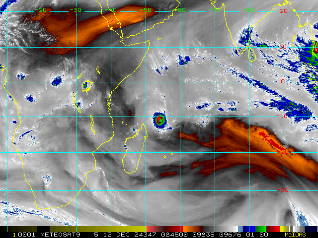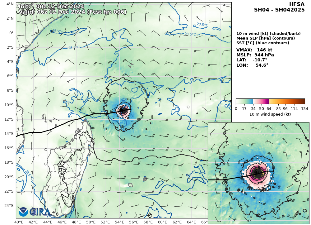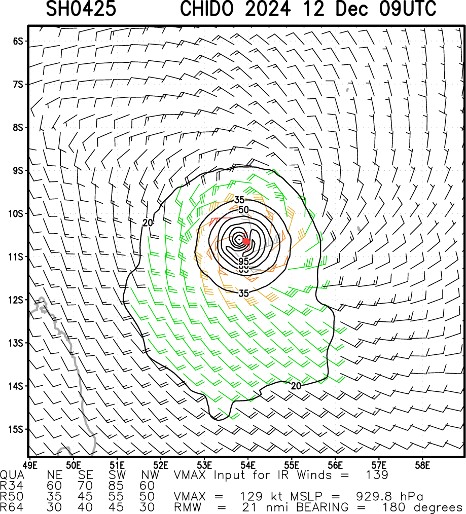 SOUTHERN HEMISPHERE: SOUTH INDIAN OCEAN: TC 04S(CHIDO). 20241212/06UTC ESTIMATED LOCATION AND INTENSITY: 135 KNOTS/CAT 4 SUPER TYPHOON +50 KNOTS OVER 24 HOURS
