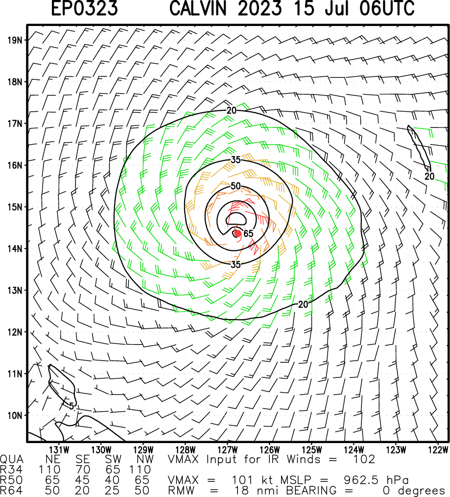 EASTERN NORTH PACIFIC: HU 03E(CALVIN). WARNING 14 ISSUED AT 150400UTC. ESTIMATED INTENSITY WAS 105 KNOTS/ CAT 3 US.