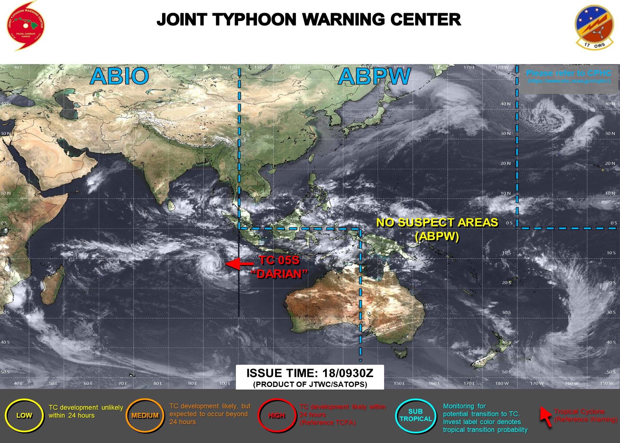 SATELLITE ANALYSIS, INITIAL POSITION AND INTENSITY DISCUSSION: ANIMATED MULTISPECTRAL SATELLITE IMAGERY (MSI) DEPICTS DEEP CONVECTION EXPANDING OVER AN INCREASINGLY TIGHTLY-WRAPPED LOW LEVEL CIRCULATION. THE INITIAL POSITION IS PLACED WITH MEDIUM CONFIDENCE BASED ON RECENT MULTI-AGENCY SATELLITE FIXES AND A 180343Z METOP-B ASCAT PASS. THE INITIAL INTENSITY OF 35 KTS IS ASSESSED WITH HIGH CONFIDENCE BASED ON THE SAME DATASETS. TC 05S HAS CONSOLIDATED INTO A TROPICAL CYCLONE WITH THE ENVIRONMENTAL SUPPORT OF STRONG POLEWARD OUTFLOW AND LOW VERTICAL WIND SHEAR.