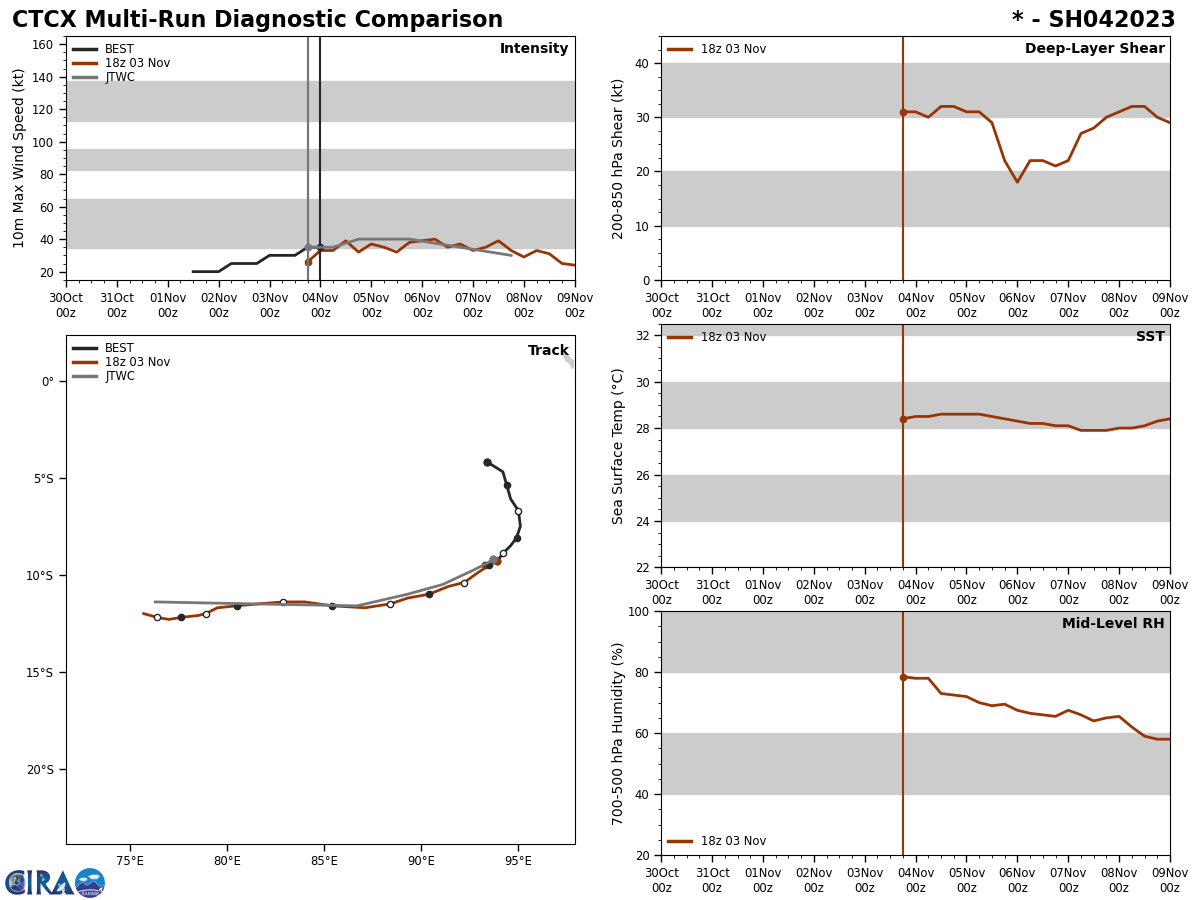 FORECAST REASONING. SIGNIFICANT FORECAST CHANGES: THIS INITIAL PROGNOSTIC REASONING MESSAGE ESTABLISHES THE FORECAST PHILOSOPHY. FORECAST DISCUSSION: TC 04S WILL CONTINUE TRACKING WEST-SOUTHWEST OF THE FIRST 36 HOURS OF THE FORECAST ALONG THE WESTERN SIDE OF THE STR CENTERED TO THE EAST. THE SYSTEM WILL GRADUALLY SLIDE OVER TO A MORE WESTWARD TRAJECTORY AS IT COMES UNDER THE STEERING INFLUENCE OF A STRONG, DEEP STR THAT WILL SET UP SHOP AROUND THE LINE OF THE 20TH LATITUDE. THAT WILL KEEP THE SYSTEM FROM MOVING FURTHER POLEWARD AFTER ABOUT TAU 36. WITH THE LOW LEVEL STRUCTURE BEING AS WELL-DEFINED AS IT IS, WITH A WIND FIELD THAT IS BETTER ORGANIZED THAN THE GLOBAL MODELS ARE DEPICTING, IT HAS A BRIEF WINDOW OF OPPORTUNITY IN WHICH TO INTENSIFY A BIT. THE LATEST IMAGERY SHOWS THE CONVECTION BLOWING OFF RAPIDLY TO THE SOUTHWEST, BUT ANOTHER ROUND OF CONVECTIVE DEVELOPMENT IS LIKELY TO POP-OFF IN THE NEXT 12 TO 24 HOURS. THE ECMWF IN PARTICULAR IS ON BOARD WITH A REDUCTION IN THE NORTHEASTERLY SHEAR COMPONENT AFTER TAU 12, WHICH WILL ALLOW FOR THE SYSTEM TO BECOME MARGINALLY BETTER ORGANIZED AND INTENSIFY UP TO A PEAK OF 40 KNOTS BY TAU 24. CONDITIONS REMAIN STEADY STATE FROM THERE UNTIL ABOUT TAU 48, WHERE SHEAR WILL START PICKING UP ONCE MORE AND THE SYSTEM WILL FEEL THE EFFECTS OF SOME DRY AIR ENTRAINMENT, LEADING TO A SLOW DECREASE IN INTENSITY THROUGH THE REMAINDER OF THE FORECAST. THE SYSTEM IS EXPECTED TO WEAKEN BELOW 35 KNOTS BY TAU 96, BUT THE REMNANT CIRCULATION IS VERY LIKELY TO CONTINUE TRACKING WESTWARD AS A DISTINCT ENTITY FOR SOME TIME AFTERWARDS.