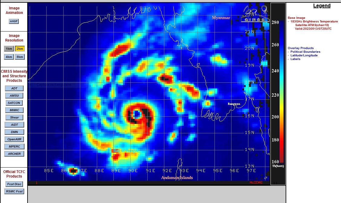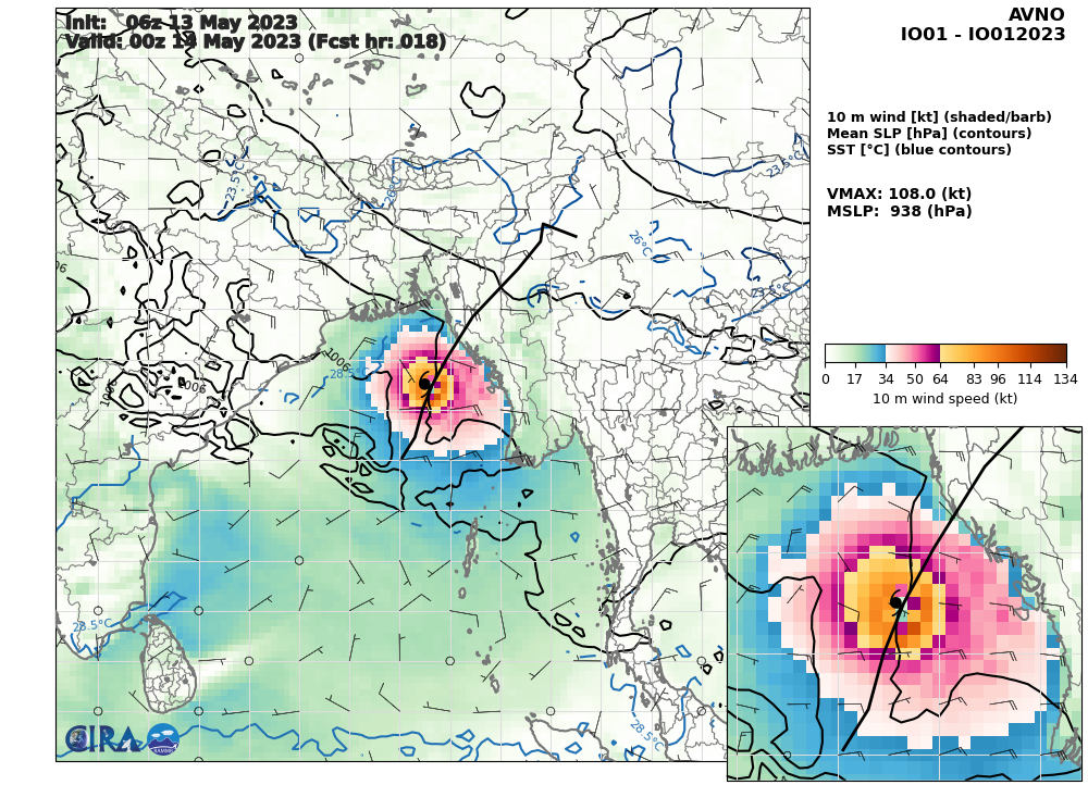 FORECAST REASONING. SIGNIFICANT FORECAST CHANGES: THERE ARE NO SIGNIFICANT CHANGES TO THE FORECAST FROM THE PREVIOUS WARNING. FORECAST DISCUSSION: THERE IS NO SIGNIFICANT CHANGE IN THE TRACK FORECAST, WITH THE SYSTEM EXPECTED TO TRACK NORTHEASTWARD THROUGH THE FORECAST PERIOD. DUE AN INCREASE IN TRACK SPEED, LANDFALL IS EXPECTED SLIGHTLY EARLIER THAN PREVIOUSLY FORECAST, BUT WILL STILL BETWEEN TAUS 12 AND 18 ALONG THE COAST OF MYANMAR, NEAR SITWE. AFTER LANDFALL, THE SYSTEM WILL CONTINUE TO ACCELERATE TOWARDS THE NORTHEAST ALONG THE TIGHT STEERING GRADIENT. IN TERMS OF INTENSITY, THE SYSTEM STILL HAS SOME TIME UNDER NEAR-OPTIMAL CONDITIONS, WHICH WILL SUPPORT ADDITIONAL INTENSIFICATION. SHEAR IS VERY LOW AT PRESENT, ESTIMATED AT BETWEEN 5-10 KNOTS AT BEST. COMBINED WITH THE ZESTY WATERS BELOW AND THE ROBUST OUTFLOW ALOFT, THE SYSTEM IS LIKELY TO MAKE A RUN AT 140 KNOTS OR A BIT HIGHER WITHIN THE NEXT 6 TO 12 HOURS. THE CIMSS M-PERC EYEWALL REPLACEMENT CYCLE (ERC) PREDICTION TOOL IS INDICATING A MODERATE PROBABILITY OF AN ERC AND THE PRESENCE OF THE AFOREMENTIONED SBC FEATURE IN THE MICROWAVE IMAGERY PROVIDES ANOTHER HINT THAT AN ERC COULD BE IN THE OFFING, THOUGH THE EXACT TIMING OF ONSET IS DIFFICULT TO PREDICT. THE FORECAST CALLS FOR A PEAK NEAR 140 KNOTS OR ABOVE AROUND TAU 6, FOLLOWED BY THE ONSET OF ERC WHICH WILL LEAD TO A SLOW WEAKENING BY TAU 12, BACK TO 130 KNOTS. THEREAFTER THE SYSTEM WILL FEEL THE EFFECTS OF SLIGHTLY COOLER SSTS ALONG THE COAST, AS WELL AS AN INCREASE IN MID-LEVEL SHEAR WHICH WILL LEAD TO GENERAL WEAKENING PRIOR TO LANDFALL, THOUGH THE SYSTEM WILL STILL BE AT OR ABOVE 115 KNOTS AT LANDFALL. AFTER LANDFALL THE SYSTEM WILL RAPIDLY WEAKEN DUE TO VERY HIGH SHEAR AND TERRAIN INTERACTION, FULLY DISSIPATING NO LATER THAN TAU 48 OVER NORTHERN MYANMAR.