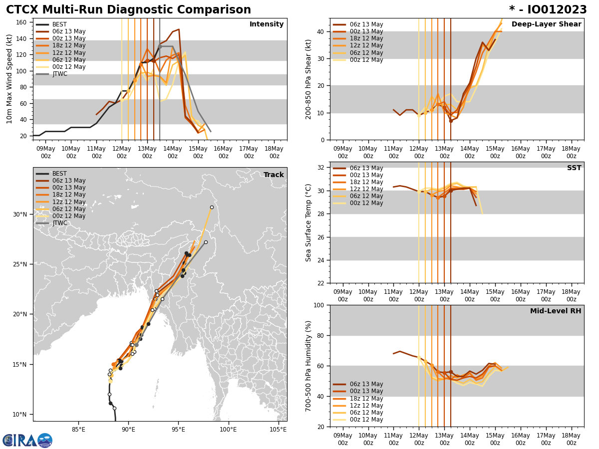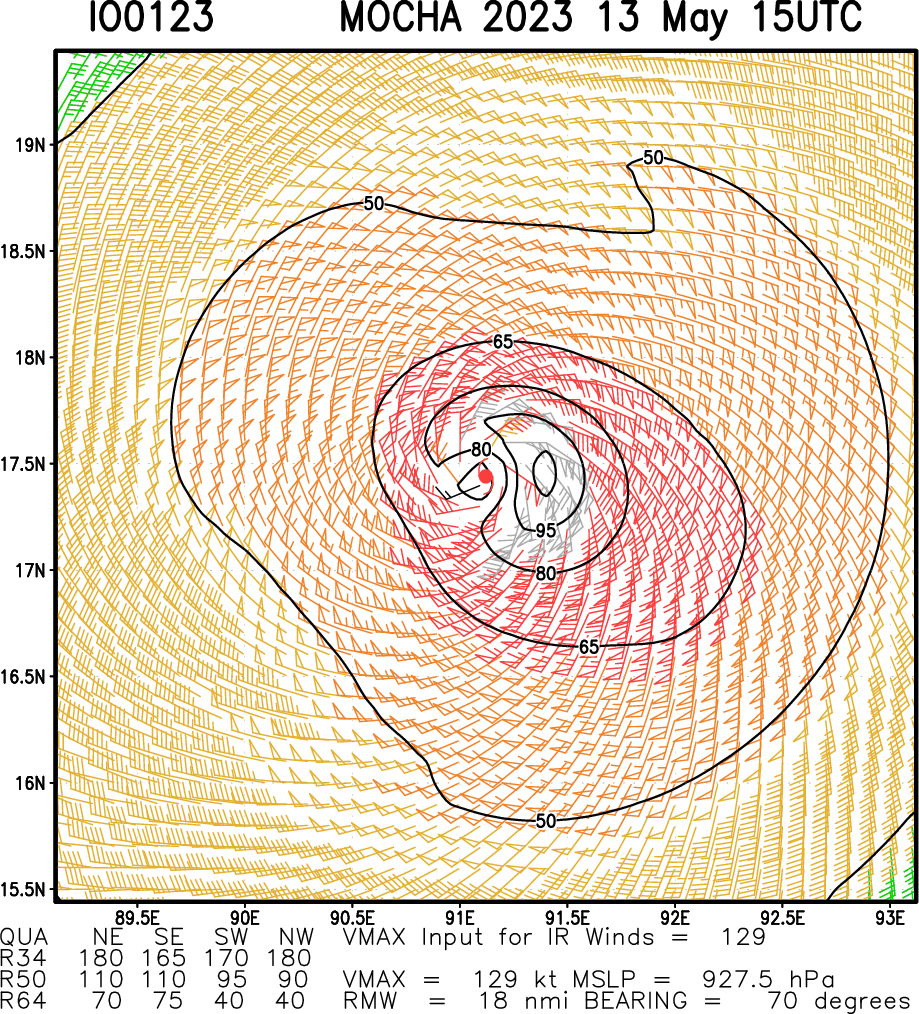 SATELLITE ANALYSIS, INITIAL POSITION AND INTENSITY DISCUSSION: TROPICAL CYCLONE (TC) 01B (MOCHA) HAS RAPIDLY INTENSIFIED OVER THE PAST SIX HOURS, HAVING CONSOLIDATED A TIGHT INNER-CORE OF CONVECTION AND ESTABLISHED A WELL-DEFINED EYEWALL. ANIMATED ENHANCED INFRARED (EIR) SATELLITE IMAGERY DEPICTS A 19-NM WIDE EYE FEATURE, WITH CENTER TEMPERATURES APPROACHING -10C AND DEEP CONVECTIVE BANDS COMPLETELY SURROUNDING THE INNER CORE. THE 131226Z GMI AND 131156Z SSMIS 89GHZ MICROWAVE IMAGES DEPICTED A SOLID INNER EYEWALL, AS WELL AS A STATIONARY BANDING COMPLEX (SBC) TO THE SOUTH, WHICH IN THE GMI PASS HAS NOW BECOME SEPARATED FROM THE PRIMARY EYEWALL, WHICH MAY HAVE SOME IMPACTS DOWN THE ROAD. ANIMATED WATER VAPOR IMAGERY AND THE CIRA ADVECTED LAYER PRECIPITABLE WATER PRODUCT CONFIRM THE SIGNIFICANT MOISTENING OF THE ENVIRONMENT ON THE NORTH SIDE OF THE SYSTEM, AND THE DRASTIC IMPROVEMENT IN POLEWARD OUTFLOW, AS THE SYSTEM IS NOW SOLIDLY CONNECTED TO OUTFLOW CHANNEL INTO THE RIGHT ENTRANCE REGION OF THE JET MAX OVER SOUTHERN CHINA. THE INITIAL POSITION IS ASSESSED WITH HIGH CONFIDENCE BASED ON THE RECENT MICROWAVE IMAGES NOTED ABOVE. THE INITIAL INTENSITY IS ASSESSED WITH HIGH CONFIDENCE BASED ON A BLEND OF THE AGENCY CURRENT INTENSITY ESTIMATES, ALONG WITH THE DEEP MICRONET (DMN) AND OPEN-AIIR ESTIMATES OF 127 KNOTS AND 132 KNOTS RESPECTIVELY. THE SYSTEM CONTINUES TO TRACK NORTHEASTWARD ALONG THE NORTHWEST SIDE OF THE SUBTROPICAL RIDGE (STR) AND IS PICKING UP SPEED. CONDITIONS REMAIN FAVORABLE FOR INTENSIFICATION, WITH LOW (5-10 KTS) VWS, WARM (30-31C) SSTS AND ROBUST OUTFLOW.