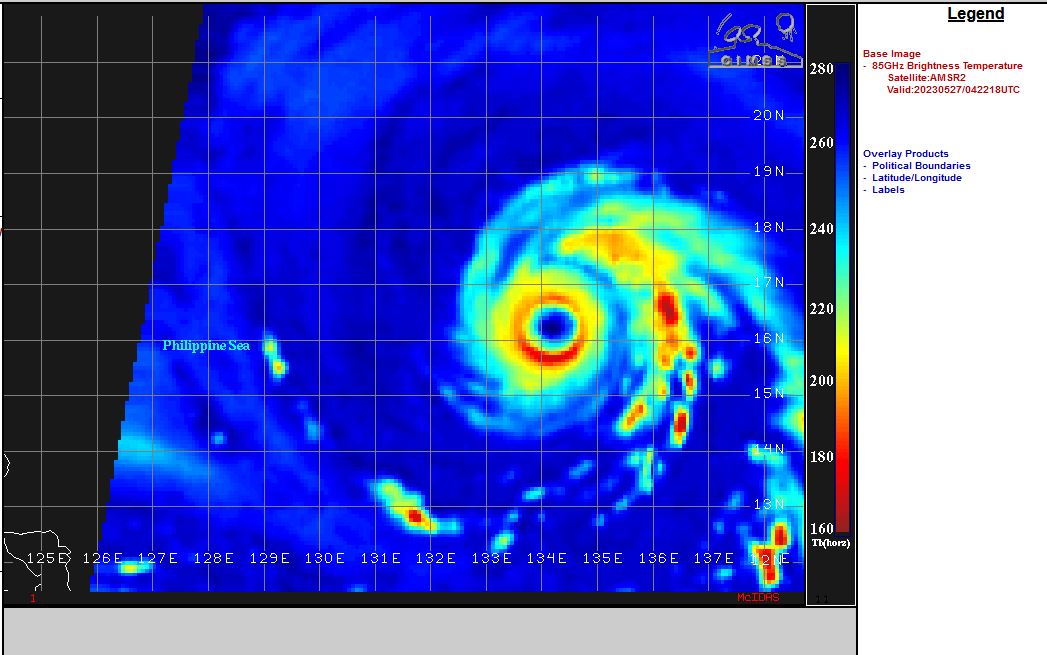 SATELLITE ANALYSIS, INITIAL POSITION AND INTENSITY DISCUSSION: ANIMATED MULTISPECTRAL SATELLITE IMAGERY (MSI) INDICATES A SYMMETRIC SYSTEM OF TIGHTLY WRAPPING DEEP CONVECTIVE BANDS FEEDING INTO A LARGE (30NM) EYE. A RECENT 270421Z AMSR2 89GHZ MICROWAVE IMAGE REVEALS A LARGE AND NEARLY COMPLETE EYE WALL WITH NUMEROUS FRAGMENTED DEEP CONVECTIVE BANDS WRAPPING INTO THE SYSTEM FROM THE SOUTH AND WEST. THE INITIAL POSITION IS PLACED WITH HIGH CONFIDENCE BASED ON THE 30NM EYE IN BOTH MSI AND AMSR2 MICROWAVE IMAGERY. THE INITIAL INTENSITY IS PLACED WITH MEDIUM CONFIDENCE BASED ON DVORAK INTENSITY ESTIMATES WHICH INDICATE 127KTS AND CIMMS ADT/AiDT INDICATING 115-120KTS WHILE CIMMS D-MINT AND D-PRINT REMAIN HIGHER AT 151KTS AND 137KTS RESPECTIVELY. HAVING LIKELY CONCLUDED AN EYE WALL REPLACEMENT CYCLE (ERC) WITHIN THE PAST 6 HOURS, THE INTENSITY OF THE SYSTEM MAY HAVE DROPPED TEMPORARILY AS THE NEW EYE WALL FORMS AND SETTLES IN, SO A RUSH TO DRAMATICALLY WEAKEN THE SYSTEM MAY NOT BE THE CORRECT PATH.
