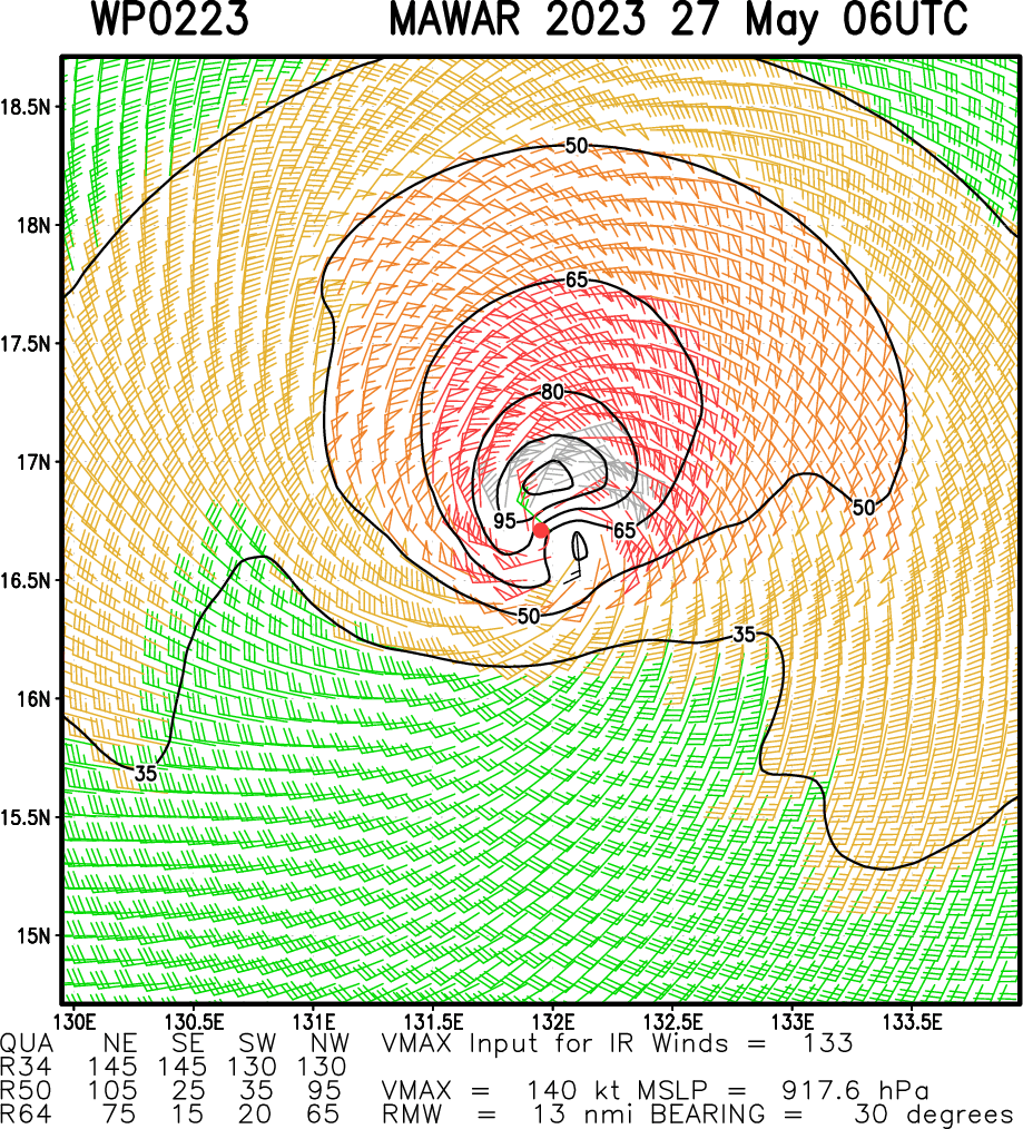 FORECAST REASONING. SIGNIFICANT FORECAST CHANGES: THERE ARE NO SIGNIFICANT CHANGES TO THE FORECAST FROM THE PREVIOUS WARNING. FORECAST DISCUSSION: STY 02W (MAWAR) IS FORECASTED TO CONTINUE TRACKING WEST-NORTHWESTWARD UNDER THE STEERING INFLUENCE OF THE STR TO THE NORTHEAST. OVER THE COMING HOURS, STY 02W IS LIKELY TO CONTINUE ON THIS WEAKENING TREND AND FINALLY WEAKEN BELOW STY STRENGTH BY TAU 24 AS IT MOVES INTO A LESS FAVORABLE ENVIRONMENT CHARACTERIZED BY COOLING SSTS AND DRY AIR ENTRAINMENT FROM THE WEST. BY TAU 48, AS 02W APPROACHES THE LUZON STRAIT, IT WILL ENTER A COMPLEX AND COMPETING STEERING ENVIRONMENT ENTRENCHED BETWEEN A STR TO THE NORTHWEST OVER SOUTHEAST CHINA AND THE OTHER STR TO THE NORTHEAST. AFTER TAU 48, WEAK OUTFLOW, COOLER SSTS AND DRY-AIR ENTRAINMENT FROM CHINA, WILL CONSPIRE TO FURTHER WEAKEN THE SYSTEM AS IT TRANSITIONS INTO A GENERALLY NORTHWARD HEADING. AS STY 02W EVENTUALLY STEADIES UP ON A NORTH-NORTHEASTWARD TRACK IN AN INCREASINGLY HARSH ENVIRONMENT, INTENSITIES WILL FALL TO AROUND 60KTS BY TAU 120 AND CONTINUE TO FALL THEREAFTER.