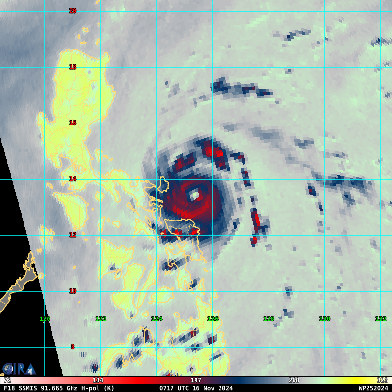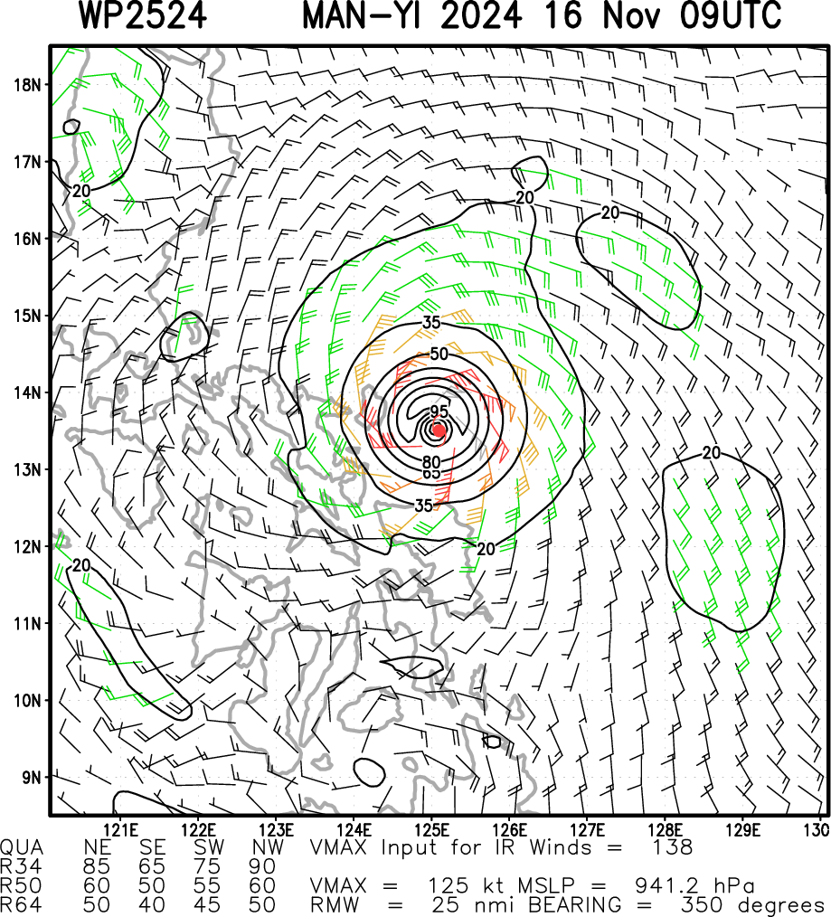 SATELLITE ANALYSIS, INITIAL POSITION AND INTENSITY DISCUSSION: ANIMATED MULTISPECTRAL SATELLITE IMAGERY (MSI) DEPICTS A VERY IMPRESSIVE SYSTEM, WITH A 15NM WIDE STADIUM EYE WITH MULTIPLE MESOVORTICES PRESENT WITHIN THE EYE. ANIMATED ENHANCED INFRARED (EIR) IMAGERY SHOWS A NEARLY SYMMETRICAL CENTRAL DENSE OVERCAST (CDO) EXTENDING OUTWARD FOR APPROXIMATELY 85NM TO 100NM, WITH THE COLDEST CLOUD TOPS AROUND -72C, OR ABOUT 3C WARMER THAN A FEW HOURS AGO. THE EYE TEMPERATURE IS MEASURED AT +21C, SLIGHTLY COOLER THAN WHEN AT ITS WARMEST (+25C) ABOUT THREE HOURS AGO. THE LAST HIGH-RESOLUTION MICROWAVE PASS FROM 2119Z REVEALED A POSSIBLE SECONDARY EYEWALL BEGINNING TO FORM, BUT THE SYSTEM HAS NOT SHOWN ANY OVERT SIGN OF AN EYEWALL REPLACEMENT CYCLE (EWRC). REGARDLESS OF THE DETAILS, STY 25W REMAINS AN EXTREMELY STRONG AND DANGEROUS SYSTEM. AT ANALYSIS TIME, THE CENTER WAS LOCATED 95NM SOUTHEAST OF VIGA AND 123NM EAST OF LEGAZPI CITY. THE INITIAL POSITION WAS ASSESSED WITH HIGH CONFIDENCE BASED ON THE SUBJECTIVE FIX POSITIONS ON THE 15NM EYE. THE INITIAL INTENSITY IS ASSESSED WITH MEDIUM CONFIDENCE, ON THE HIGHER END OF THE AGENCY DVORAK CURRENT INTENSITY ESTIMATES OF T7.0 (140 KNOTS) FROM PGTW AND RJTD. OBJECTIVE ESTIMATES CONTINUE TO BE RUNNING TOO LOW AND WITHOUT ANY RECENT WIND SPEED MEASUREMENTS, THERE IS NO WAY TO SAY WHAT THE ACTUAL INTENSITY IS WITH HIGHER CONFIDENCE. THE SYSTEM IS IN A FAVORABLE ENVIRONMENT, WITH LOW SHEAR, WARM SSTS, HIGH OHC AND GOOD RADIAL OUTFLOW.