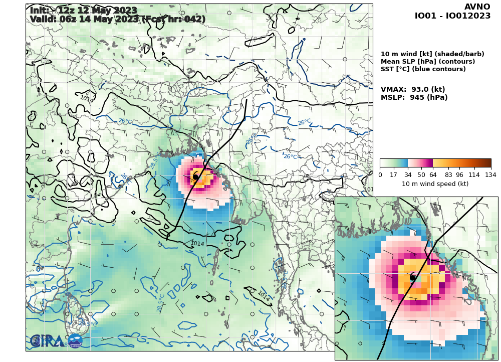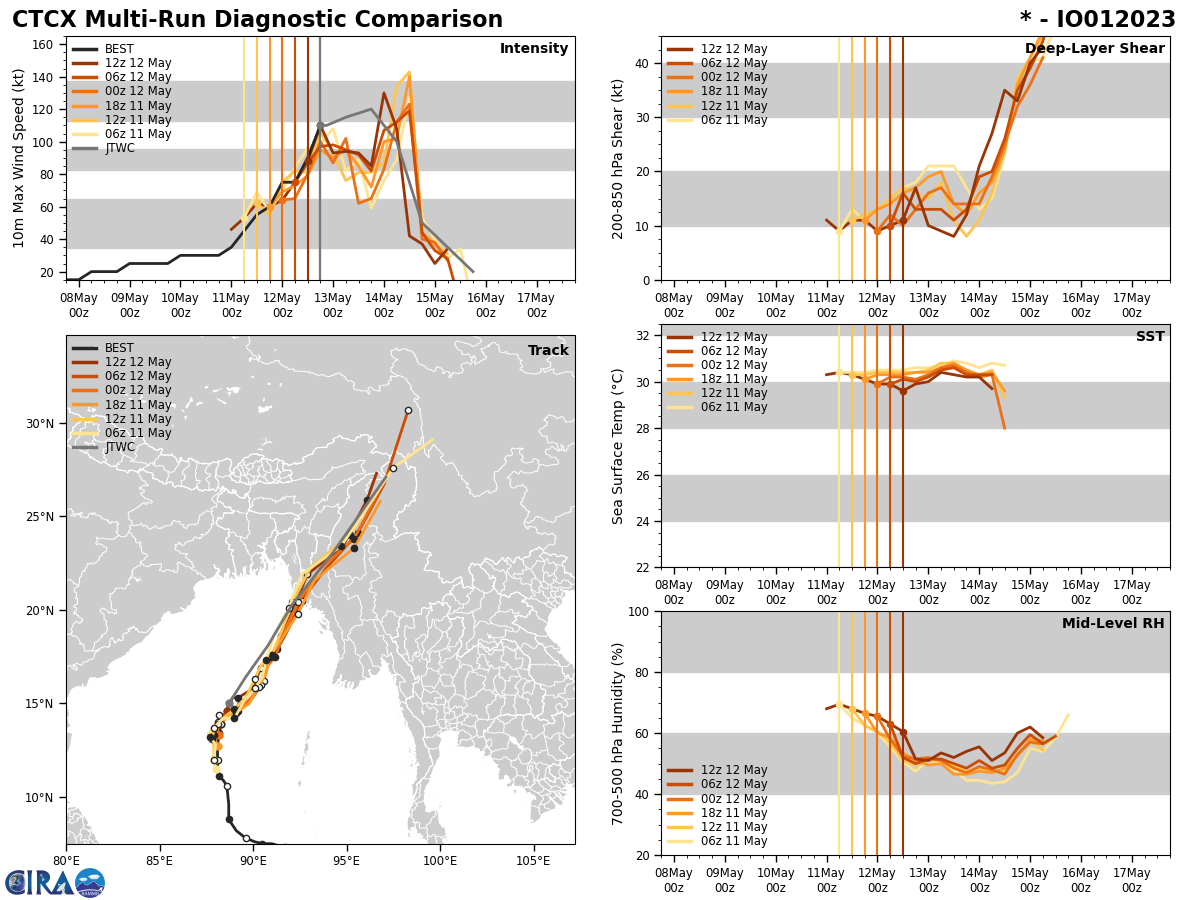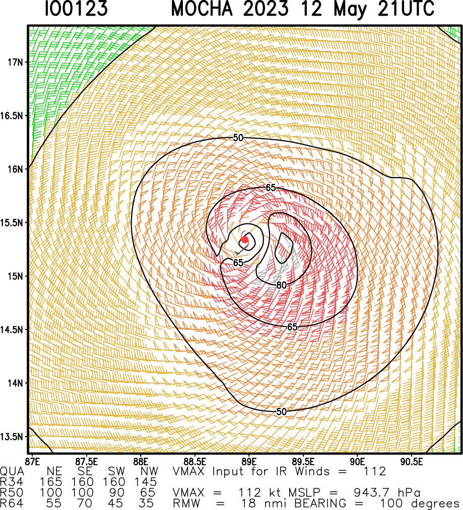 SATELLITE ANALYSIS, INITIAL POSITION AND INTENSITY DISCUSSION: ANIMATED ENHANCED INFRARED SATELLITE IMAGERY (EIR) DEPICTS A BROAD, WELL ORGANIZED SYSTEM WITH A RAGGED EYE SURROUNDED BY BANDS OF DEEP CONVECTION IN ALL QUADRANTS WRAPPING INTO THE LOW LEVEL CIRCULATION CENTER (LLCC). ANALYSIS OF MULTI-AGENCY 121800Z POSITIONS COMPARED TO PREVIOUS POSITIONS SUGGESTS THE SYSTEM HAS WOBBLED NORTHWARD. THIS BEHAVIOR IS USUALLY INDICATIVE OF A RAPIDLY STRENGTHENING SYSTEM. IN ADDITION, ANALYSIS OF THE M-PERC EYEWALL REPLACEMENT TOOL SUGGESTS AN EYEWALL REPLACEMENT CYCLE (ERC) IS UNDERWAY. ONE MAJOR CONTRIBUTING FACTOR TO THE RAPID INTENSIFICATION IS AN INTENSE POOL OF OCEAN HEAT CONTENT (OHC) THAT HAS DOMINATED THE CENTRAL BAY OF BENGAL OVER THE PAST SEVERAL DAYS. TC MOCHA IS IN A MARGINALLY FAVORABLE ENVIRONMENT FOR FURTHER TROPICAL DEVELOPMENT. THESE CONDITIONS ARE CHARACTERIZED BY STRONG POLEWARD AND EQUATORWARD OUTFLOW ALOFT, A STRONG 850 MB VORTICITY SIGNATURE, MODERATE (15-20 KTS) VERTICAL WIND SHEAR (VWS), AND VERY WARM (30-31 C) SEA SURFACE TEMPERATURES (SST). THE INITIAL POSITION IS PLACED WITH HIGH CONFIDENCE BASED ON MULTI-AGENCY FIXES, AS WELL AS THE AFOREMENTIONED EIR IMAGERY. THE INITIAL INTENSITY OF 110 KNOTS IS ASSESSED WITH MEDIUM CONFIDENCE BASED OFF A BLEND OF MULTI-AGENCY DVORAKS ESTIMATES AND THE ABOVEMENTIONED RAPID INTENSIFICATION EXAMINATION.