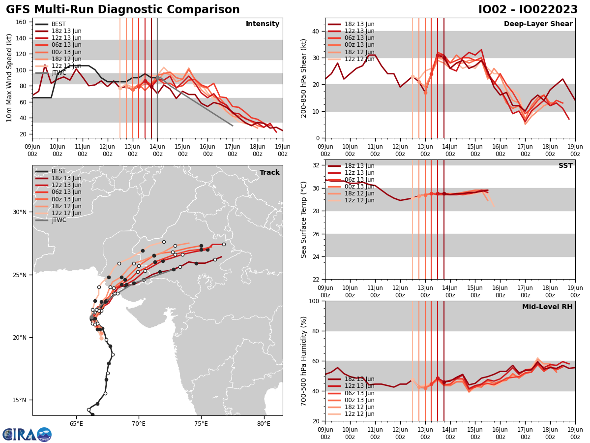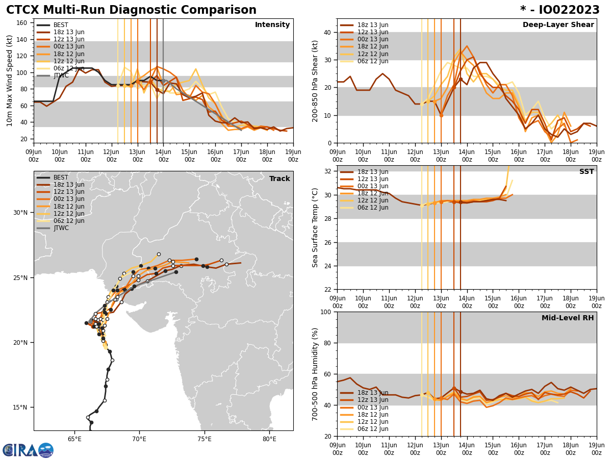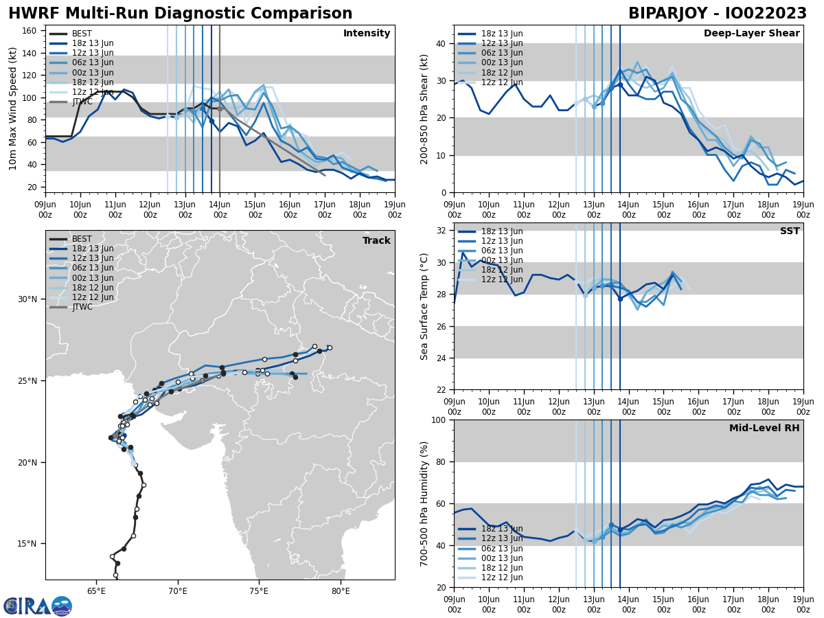 MODEL DISCUSSION: WITH THE EXCEPTION OF NAVGEM, WHICH REMAINS THE SOLE OUTLIER WITH A NORTH-NORTHEASTWARD TRACK, NUMERICAL MODEL GUIDANCE IS IN GOOD AGREEMENT WITH A 45NM CROSS-TRACK SPREAD AT LANDFALL (TAU 36). IN GENERAL, THE 131800Z ECMWF AND GFS ENSEMBLES INDICATE A SIMILAR SPREAD AND REVEAL A TIGHT GROUPING OF SOLUTIONS NEAR THE INDIA-PAKISTAN BORDER REGION. OVERALL CONFIDENCE IN THE JTWC FORECAST TRACK IS HIGH.
