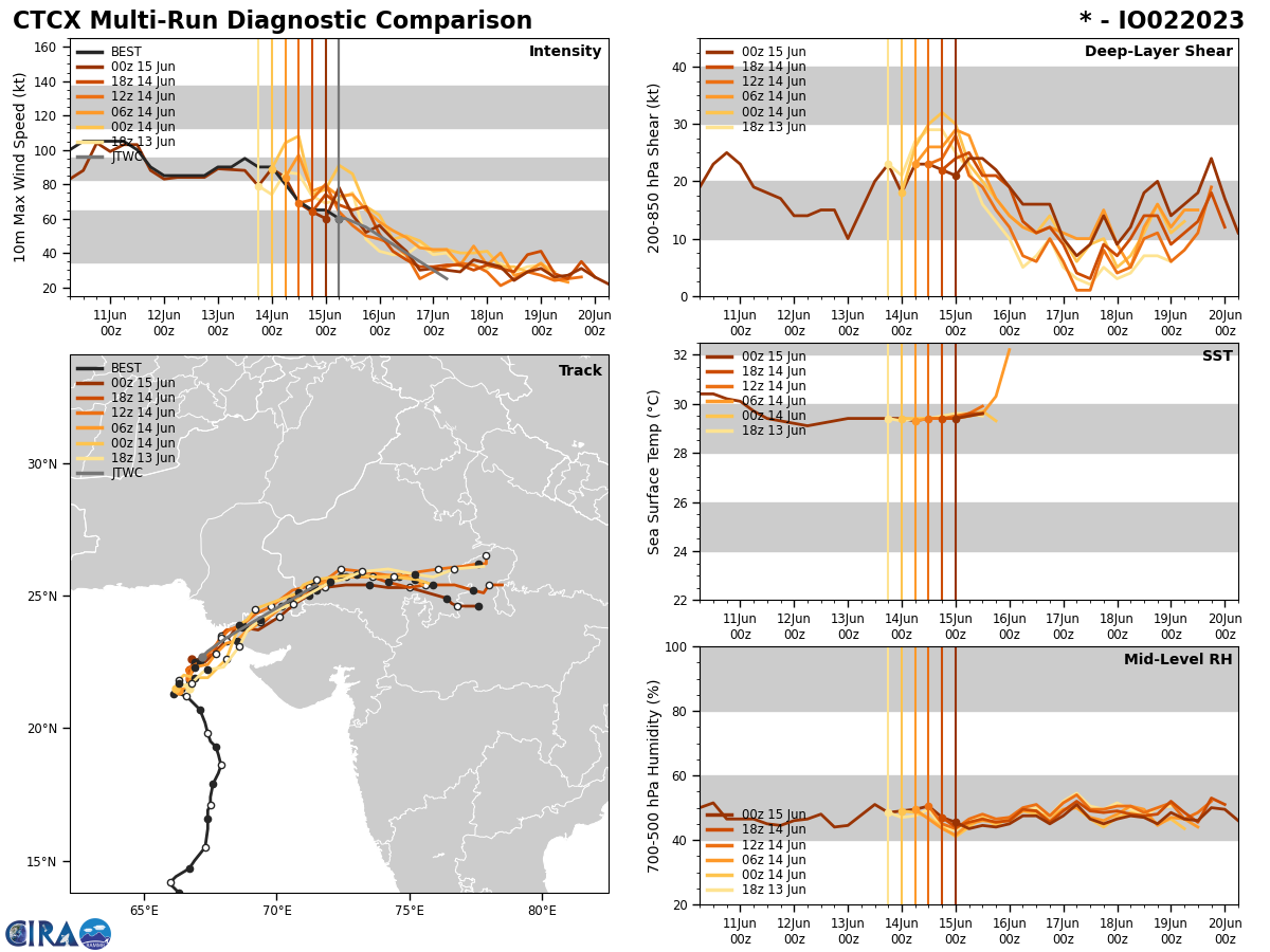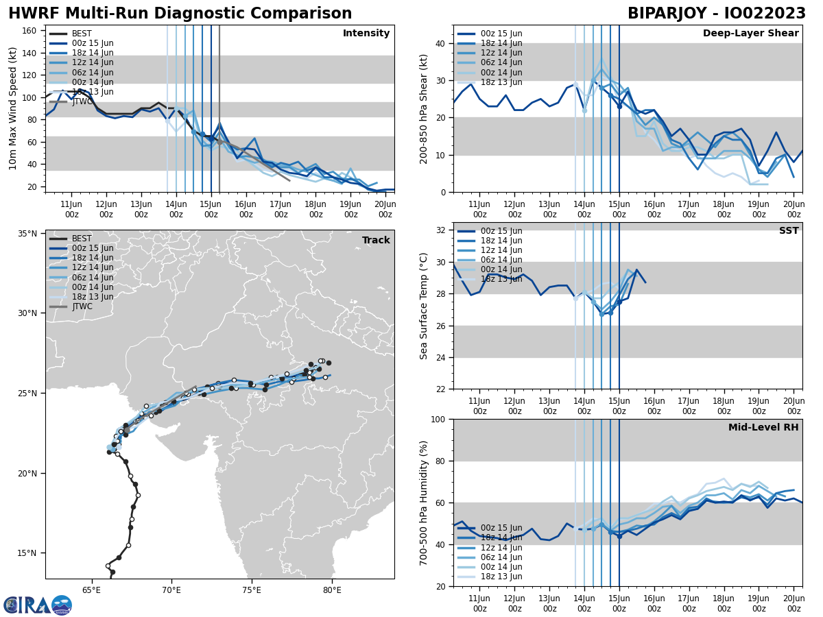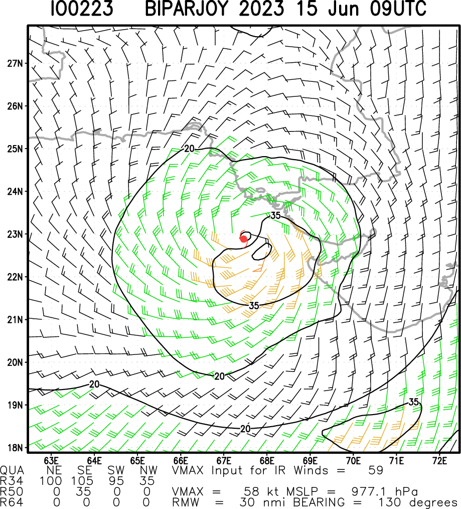 FORECAST REASONING. SIGNIFICANT FORECAST CHANGES: THERE ARE NO SIGNIFICANT CHANGES TO THE FORECAST FROM THE PREVIOUS WARNING. FORECAST DISCUSSION: THE NEARLY 800NM JOURNEY OF TC 02A (BIPARJOY) IS RAPIDLY COMING TO A CLOSE. OVER THE NEXT 12 HOURS, 02A WILL CONTINUE TO APPROACH THE PAKISTAN-INDIA BOARDER. DURING THIS TIME, INCREASING LAND INTERACTION WILL COMBINE WITH ALREADY MODERATE VERTICAL WIND SHEAR (VWS) AND DRY AIR ENTRAINMENT TO GRADUALLY WEAKEN THE SYSTEM TO AROUND 55KTS. AFTER MAKING LANDFALL JUST AFTER TAU 12, THE SYSTEM WILL BE PUSHED INLAND BY THE STR OVER SOUTHERN INDIA AND THE BUILDING RIDGE OVER THE STRAIT OF HORMUZ. AS IS USUALLY THE CASE, MAKING LANDFALL IS GAME OVER. THE SYSTEM WILL RAPIDLY WEAKEN AND DETERIORATE THROUGH TAU 36, EVENTUALLY DISSIPATING NEAR TAU 48.