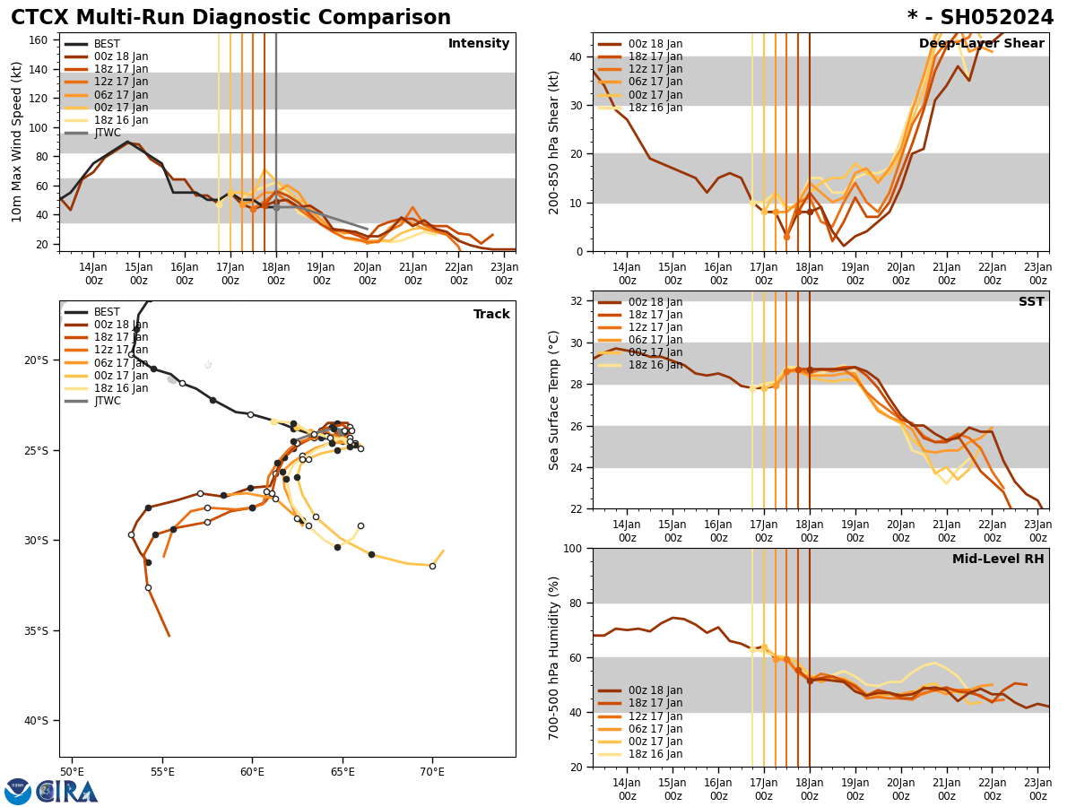 MODEL DISCUSSION: DETERMINISTIC MODEL GUIDANCE IS IN AGREEMENT THAT TC 05S (BELAL) WILL CONTINUE TO STEADILY SLOW IN ITS RE-CURVE TO THE WEST THROUGH TAU 12. THE MODELS ARE IN RELATIVE AGREEMENT THAT A DIRECTION SHIFT TO THE WEST IS EXPECTED, BACKING SLIGHTLY TO THE NORTH BY TAU 12, THEN PROGRESSING WEST AND SOUTHWESTWARD BETWEEN TAU 24 AND TAU 36. TRACK SPREAD DURING TC 05S RE-CURVE REMAINS IN CLOSE AGREEMENT WITH A CROSS-TRACK SPREAD OF 45 NM, AND INCREASING TO A CROSS-TRACK SPREAD DURING ITS SOUTHWESTWARD TREK BETWEEN TAU 24 AND TAU 48. THE CROSS-TRACK SPREAD CONTINUES TO INCREASE TO 150 NM NEAR TAU 48, AS TC 05S DISSIPATES WITH STRONG AND CONSTANT INFLUENCE FROM DRY-AIR ENTRAINMENT AND STRONG VWS. THE MAJORITY OF JTWC CONSENSUS MEMBERS AGREE THAT THE CYCLONE WILL STEADILY WEAKEN THROUGH THE END OF THE FORECAST PERIOD (TAU 48).